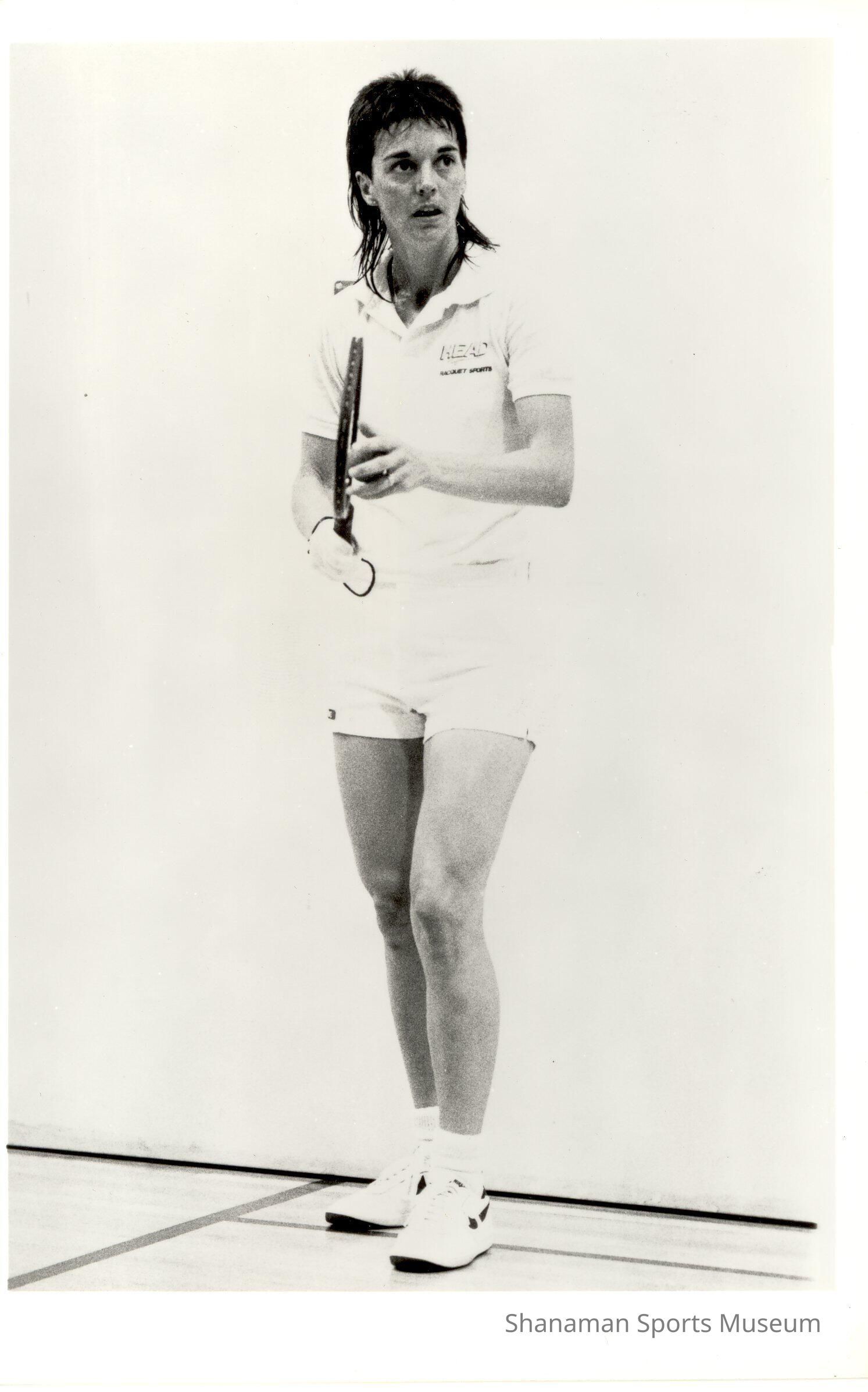 Vicki Panzeri of Seattle, who became one of the nation's top female racquetball players in the 1980s, prepares to serve in this 1985 photo. Panzeri's top national ranking was No. 2 that year (1984-85 season) behind perennial champion Lynn Adams. One of her biggest career victories came over another racquetball legend, Heather McKay, in the semifinals of the 1985 national championship tournament in Costa Mesa, CA. McKay had announced her retirement and was hoping for one more title before Panzeri -- ranked No. 3 at the time behind Adams and McKay -- pulled off the 3-2 upset. Adams then won title match, 3-0. Panzeri was in the top-10 national rankings from 1981-82 through 1987-88.Lexicon