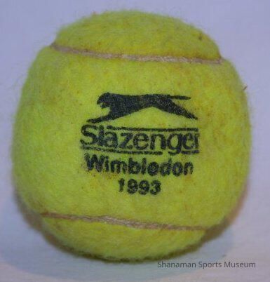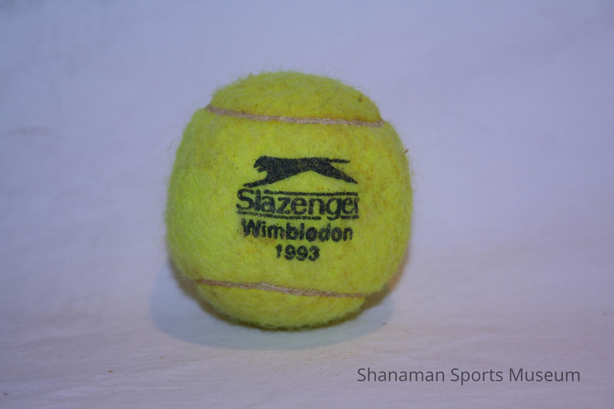 Balls, tennis - Slazenger, bright yellow, used in the 1993 Wimbledon Championships by Pat Galbraith - all the tennis balls in the case a . Total of 4 Slazenger Wimbledon 1993 balls on display in case.