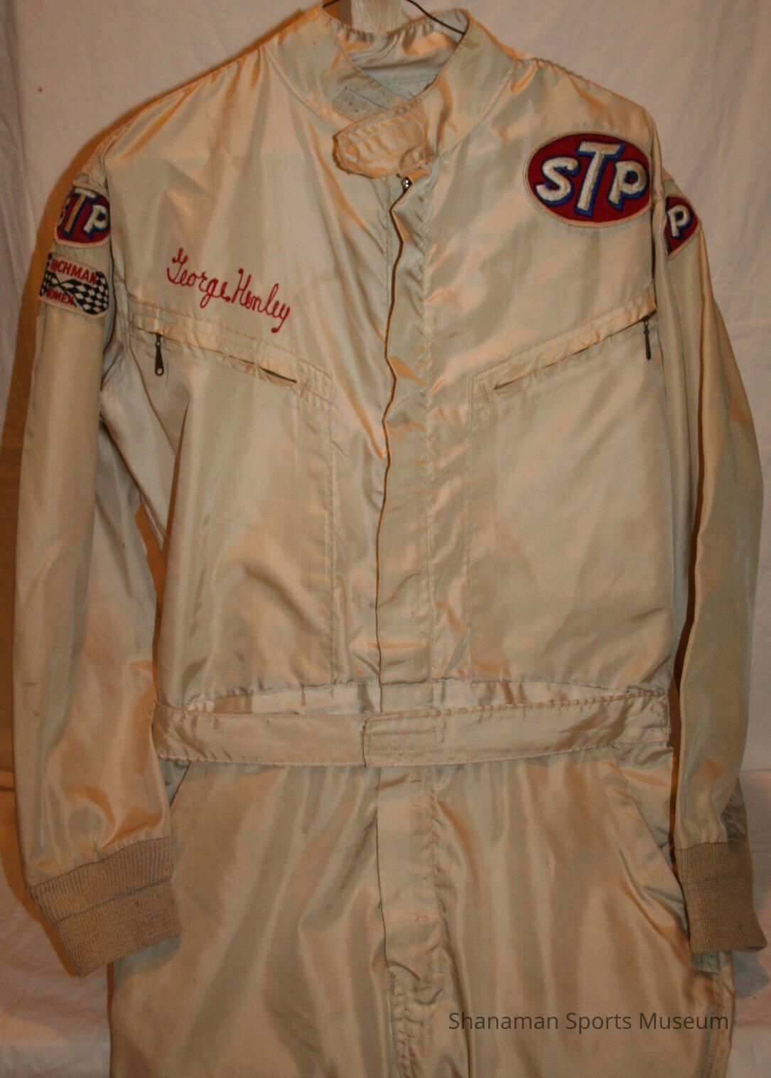 A hydroplane jumpsuit, worn by driver George Henley, has an STP logo patch on the shoulder. Henley of Eatonville, WA, was a top unlimited driver from 1970-75 and who won 12 of the 34 races he entered. He started his career as a crew member for the Miss B & I and Miss Coral Reef in the 1950s, then drove the Miss Burien Lady. Henley went on to win the 1973 high points championship and repeated in 1974 beating the popular Miss Budweiser both times.