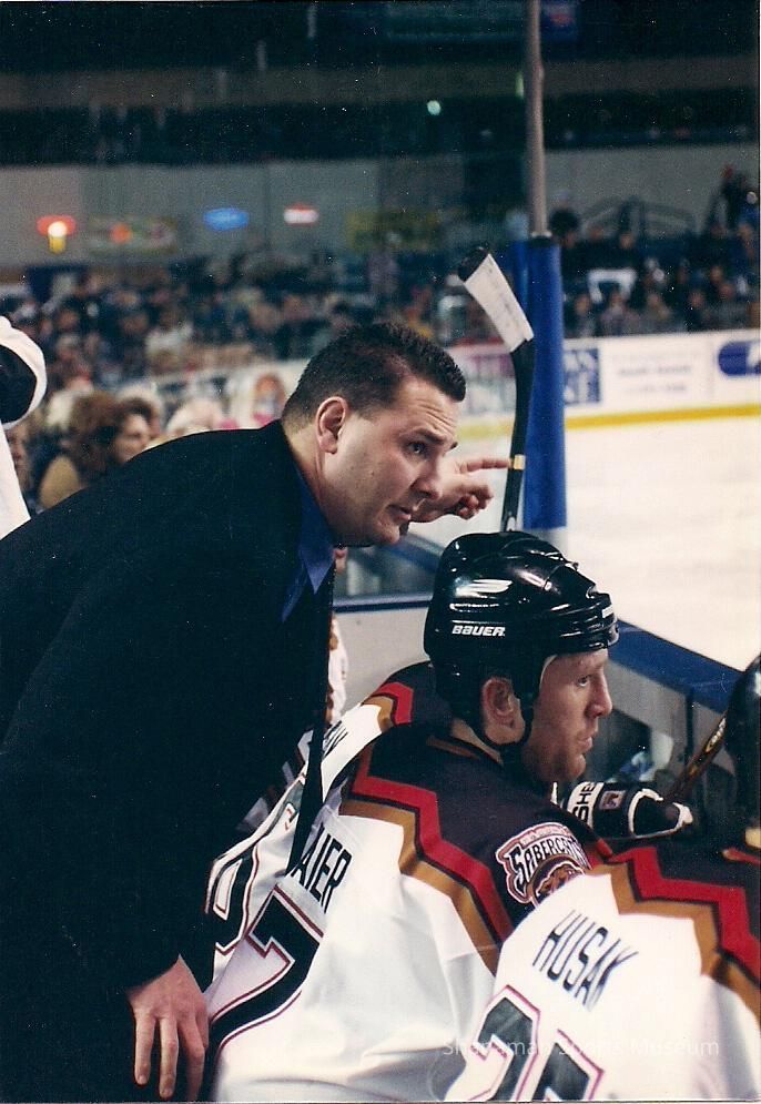 An assistant coach, unidentified, with the Tacoma Sabercats talks to players on the bench during a game in the 1999-2000 season at the Tacoma Dome. The Sabercats were a professional minor league hockey team that began playing in the 1997-88 West Coast Hockey League season and had a successful five-year run. Tacoma won the regular-season Northern Division title and reached the league finals in its first season. The Sabercats lost to the defending champion San Diego Gulls in the league’s first Taylor Cup. The following season, the Sabercats returned to the playoffs after winning the Northern Division title again and this time defeated the Gulls in the Cup finals. It would be the only league championship for the franchise, which folded after the 2001-02 season. The Sabercats made the playoffs all five seasons, winning three division championships.Made/Created