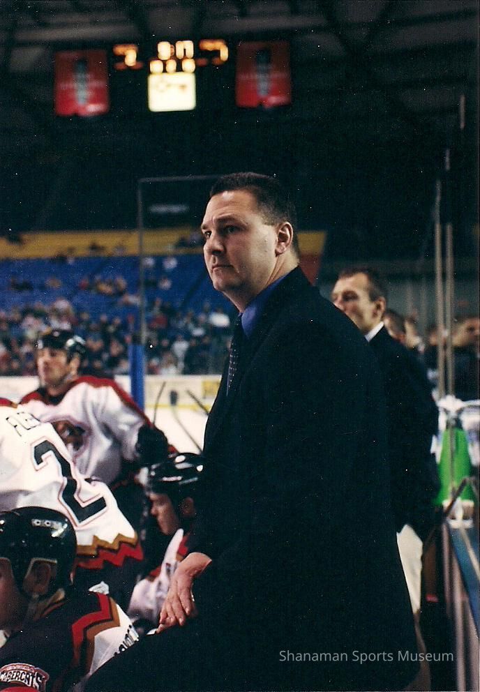 Coaches and team officials stand behind the players on the bench of the Tacoma Sabercats hockey team during a game during the 1999-2000 season at the Tacoma Dome. The Sabercats were a professional minor league hockey team that began playing in the 1997-88 West Coast Hockey League season and had a successful five-year run. Tacoma won the regular-season Northern Division title and reached the league finals in its first season. The Sabercats lost to the defending champion San Diego Gulls in the league’s first Taylor Cup. The following season, the Sabercats returned to the playoffs after winning the Northern Division title again and this time defeated the Gulls in the Cup finals. It would be the only league championship for the franchise, which folded after the 2001-02 season. The Sabercats made the playoffs all five seasons, winning three division championships.Made/Created