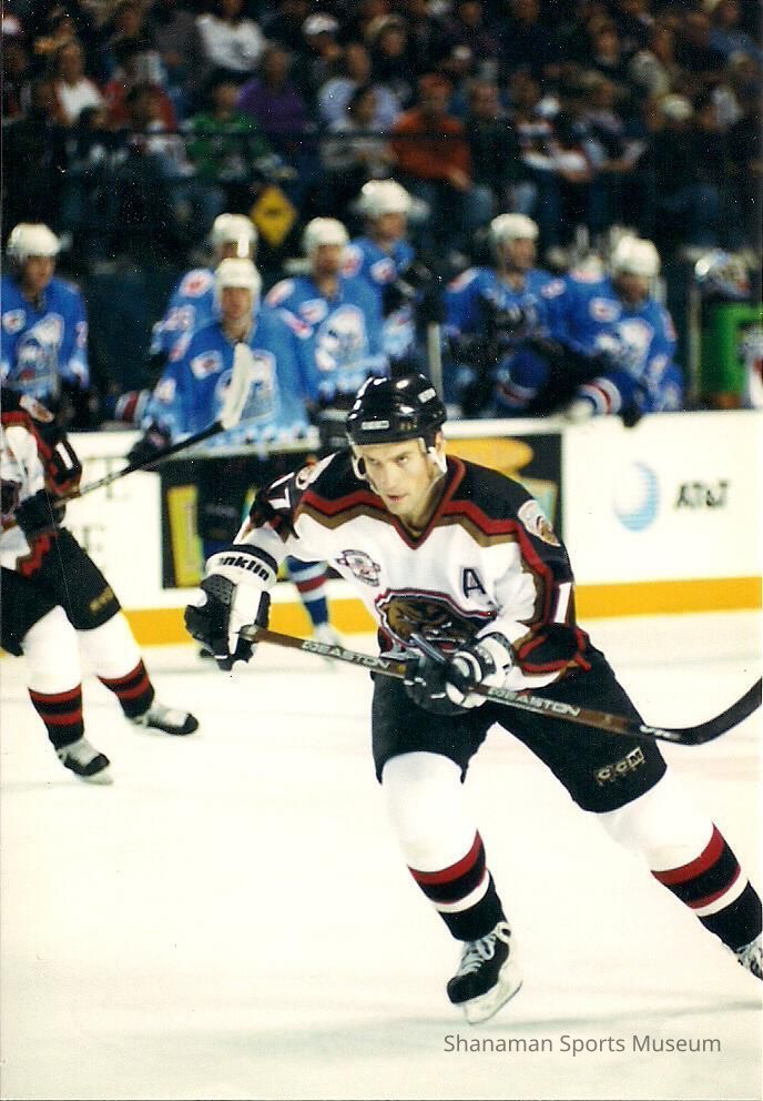 Tacoma Sabercats assistant captain, #17 Alex Alexeev skates during a shift change of a West Coast Hockey League game at the Tacoma Dome during the 1999-2000 season. The Sabercats were a professional minor league hockey team that began playing in the 1997-88 West Coast Hockey League season and had a successful five-year run. Tacoma won the regular-season Northern Division title and reached the league finals in its first season. The Sabercats lost to the defending champion San Diego Gulls in the league’s first Taylor Cup. The following season, the Sabercats returned to the playoffs after winning the Northern Division title again and this time defeated the Gulls in the Cup finals in the 1998-88 season. It would be the only league championship for the franchise, which folded after the 2001-02 season. The Sabercats made the playoffs all five seasons, winning three division championships as well.Made/Created
