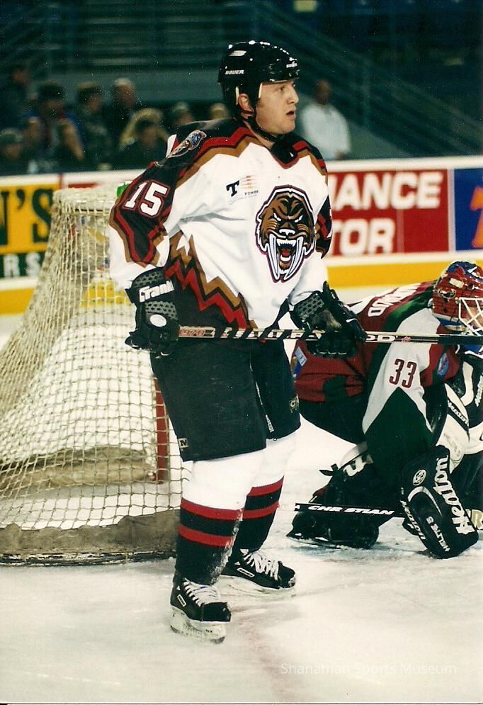An unidentified Tacoma Sabercat player #15 keeps an eye on the action during a West Coast Hockey League during the 1999-2000 season. The Sabercats were a professional minor league hockey team that began playing in the 1997-98 season. Tacoma won the regular-season Northern Division title and reached the league finals in its first season. The Sabercats lost to the defending champion San Diego Gulls in the league’s first Taylor Cup. The following season, the Sabercats returned to the playoffs after winning the Northern Division title again and this time defeated the Gulls in the Cup finals. It would be the only league championship for the franchise, which folded after the 2001-02 season. The Sabercats made the playoffs all five seasons winning three division championships as well.Lexicon