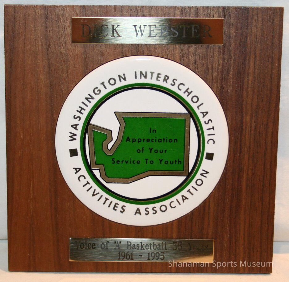 Dick Webster received this trophy from the WIAA in 1995 for his longtime announcing of high school sports. Webster was an announcer from 1961 to 1995. Webster is part of a group of announcers who committed many, many hours over the years announcing local sports. Jerry Geehan, a 1931 graduate from Lincoln High School, was another longtime announcer. In 1937, he became the first broadcaster for the Tacoma Tigers.Lexicon