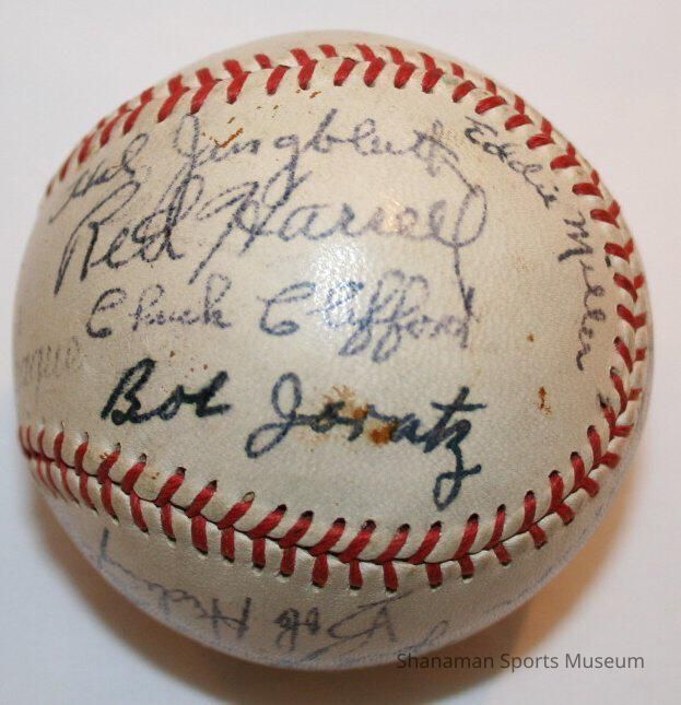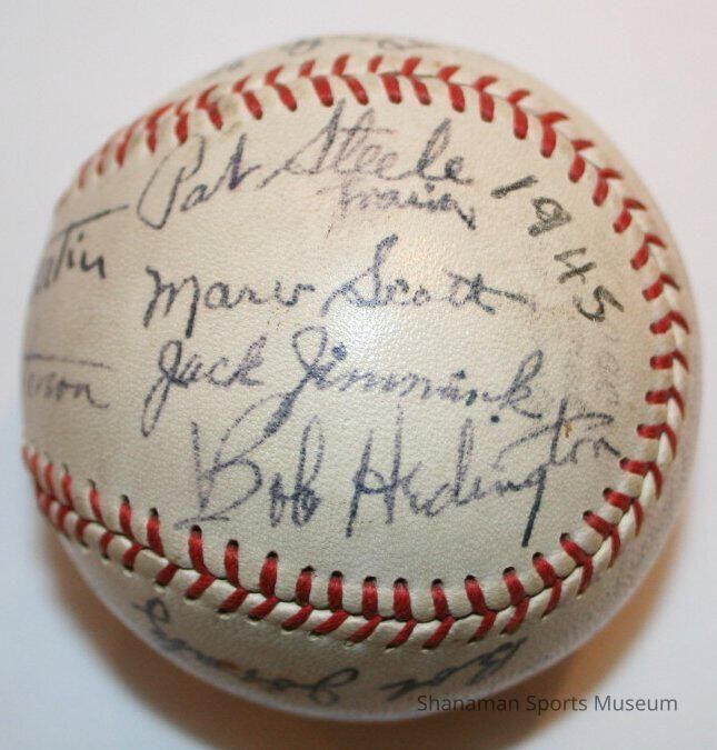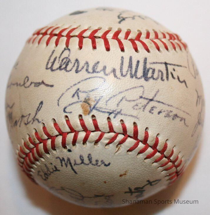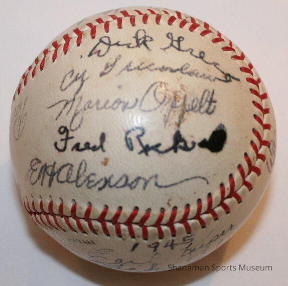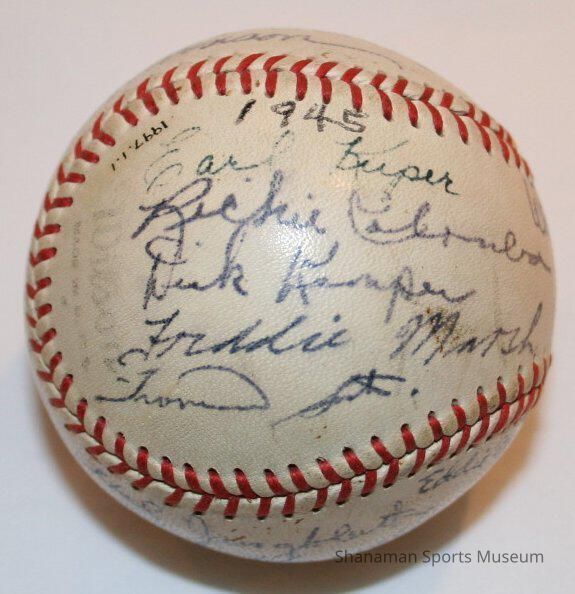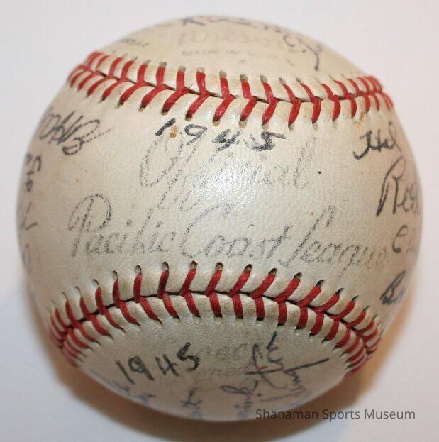 The Tacoma Tigers team that played in the Western International League autographed this baseball in 1946. In blue ink, “1945” is written in at least two locations, but that is an incorrect date. The donor was the visitor's bat boy. Tacoma's first team in the Pacific Coast League was the Tacoma Tigers, which joined the league in 1904. But after two seasons the team moved to Sacramento and the PCL didn't return to Tacoma for 55 years.Lexicon