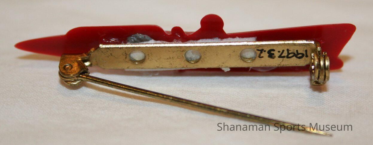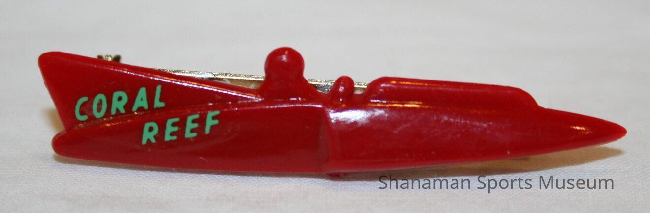 red plastic hydroplane silhouette. Small aqua colored decals of "Coral Reef"is attached. Originally ~500 made; decals put on by wives of the pit crewLexicon