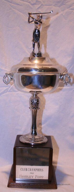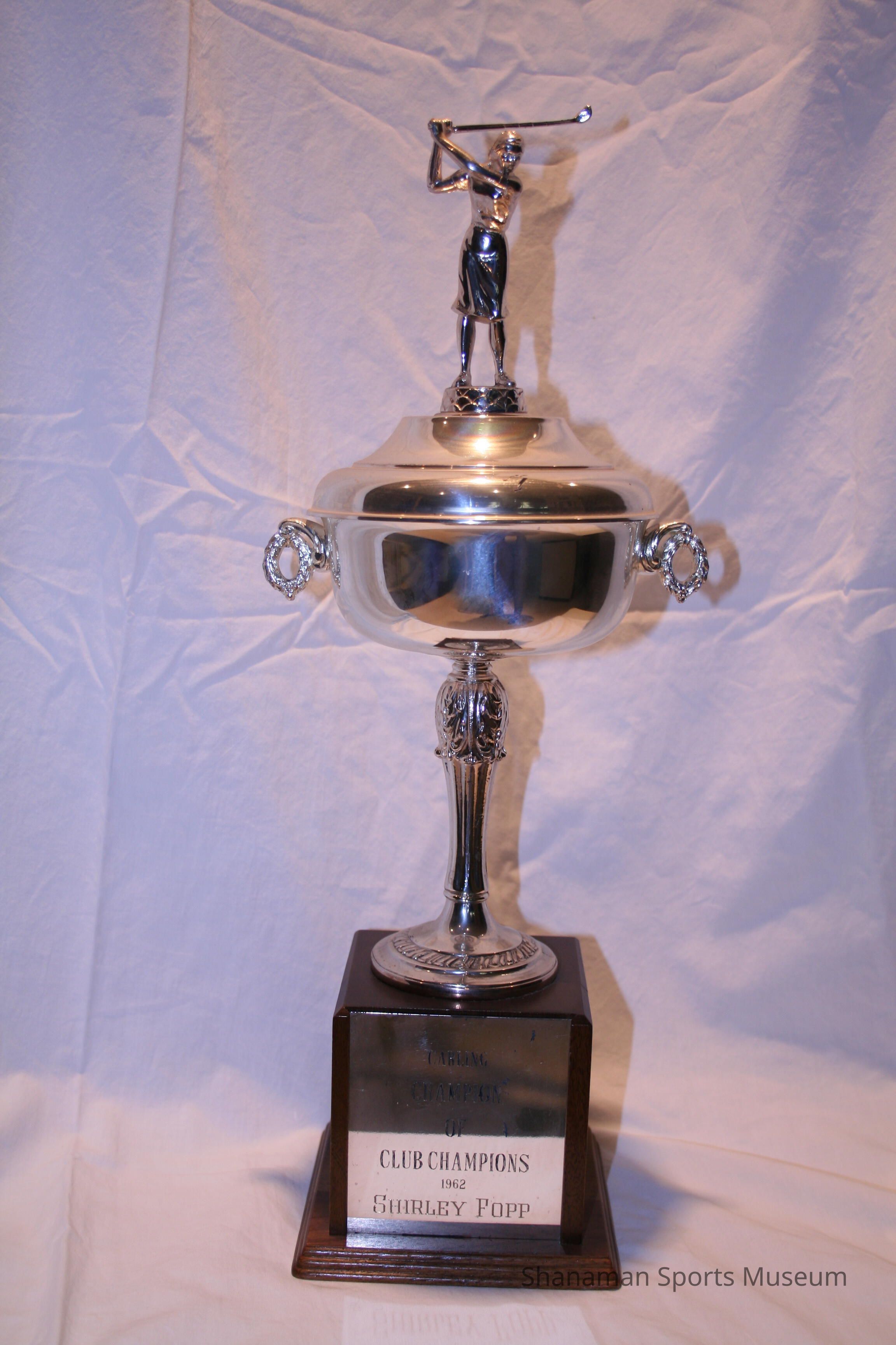 Shirley Fopp, who was both an outstanding skier and a professional golfer, won this golf trophy at the Carling Golf Championship. In 1959, Fopp was one of four women golfers from Tacoma at the dedication of the American Lake Veterans Golf Course. Fopp was also on one of two women foursomes who were the first to try out that golf course. Fopp, who was born in 1919 and died in 2002, was also a champion skier. She won the women's national downhill championship several times in the 1940s and was the only woman to win the women's Silver Skis championship twice. Fopp, who was born in Switzerland and later lived in Tacoma, is also the only three-time winner of the Parsenn Derby. In 1949, Fopp led a free ski school for Tacoma high school students. Fopp has been inducted into the Tacoma-Pierce County Sports Hall of Fame for her accomplishments as a skier and a golfer.Lexicon
