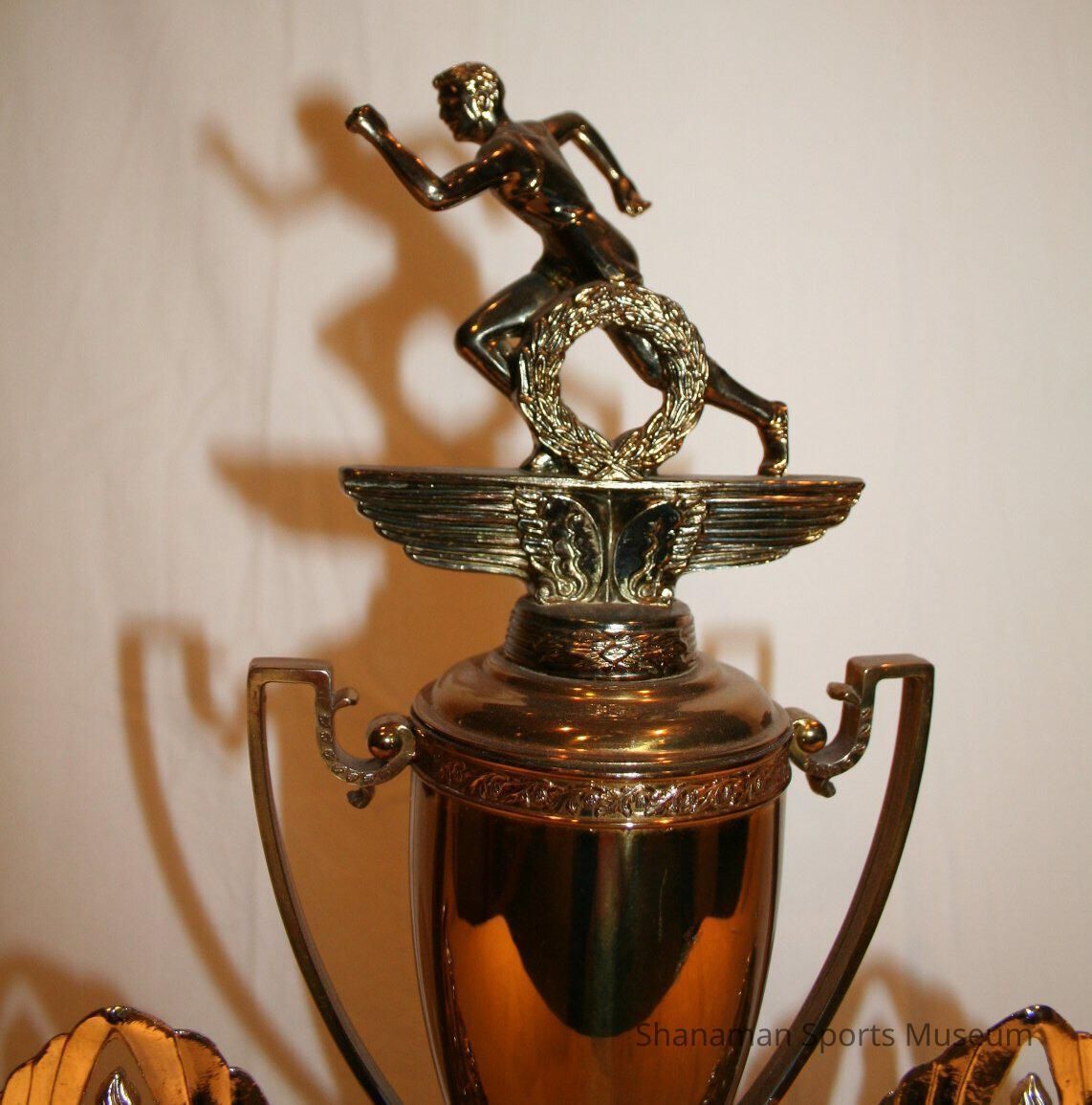 1963 track and field trophy, with a figure of a runner at the top of the trophy above a winner’s cup.