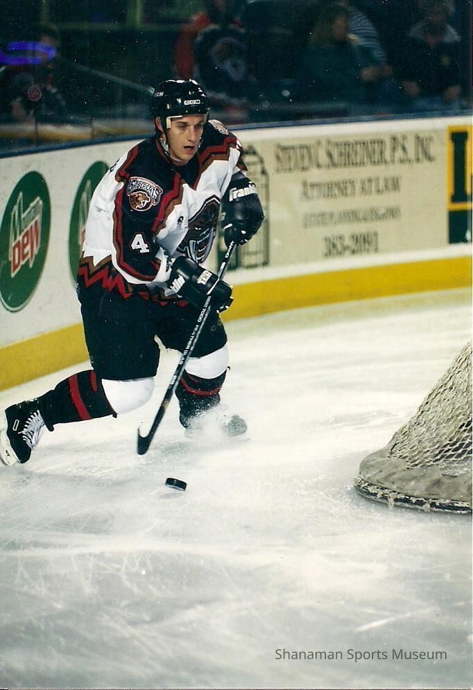 Scott Drevitch, player #4, retrieves the puck behind the goaltender during a Tacoma Sabercats hockey game at the Tacoma dome in the 1999-2000 season. The Sabercats were a professional minor league hockey team that began playing in the 1997-98 West Coast Hockey League season and had a successful five-year run. Tacoma won the regular-season Northern Division title and reached the league finals in its first season. The Sabercats lost to the defending champion San Diego Gulls in the league’s first Taylor Cup. The following season, the Sabercats returned to the playoffs after winning the Northern Division title again and this time defeated the Gulls in the Cup finals in the 1998-99 season. It would be the only league championship for the franchise, which folded after the 2001-02 season. The Sabercats made the playoffs all five seasons, winning three division championships as well.Made/Created