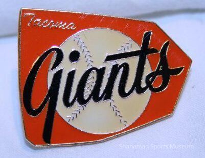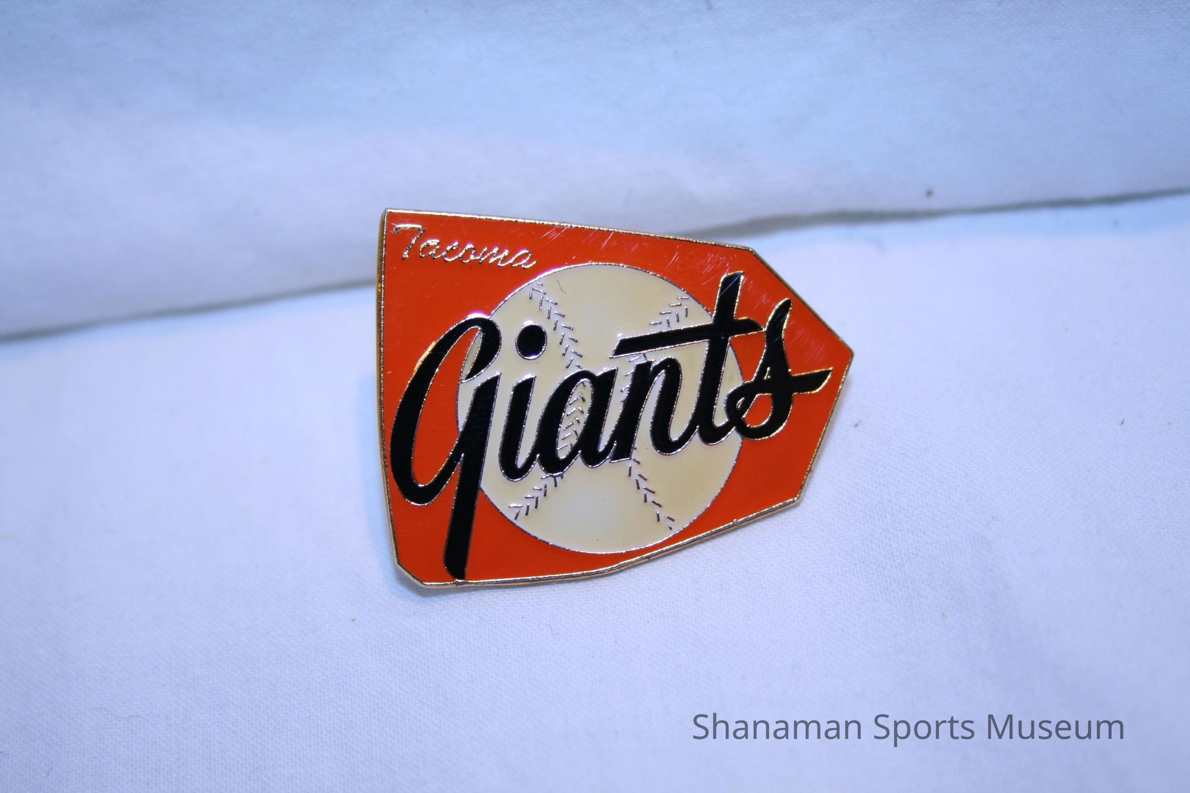 Orange and white commemorative pin with white baseball and "Giants" in black across center.