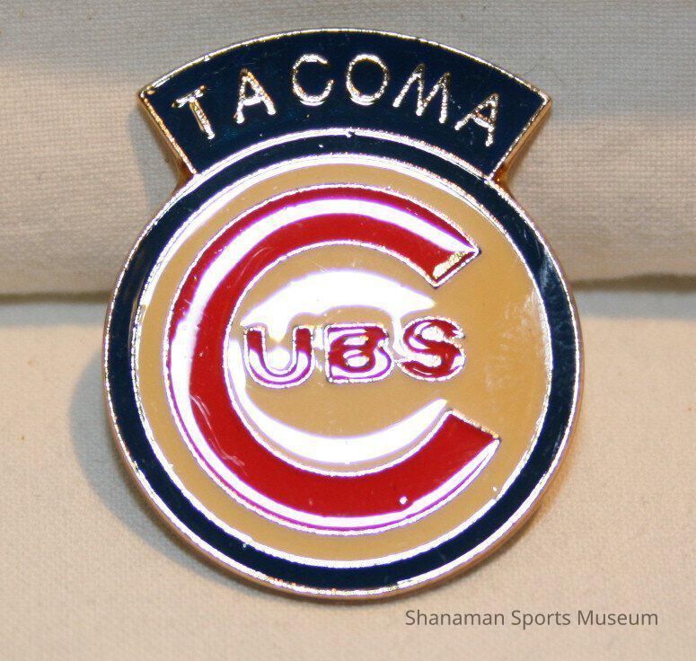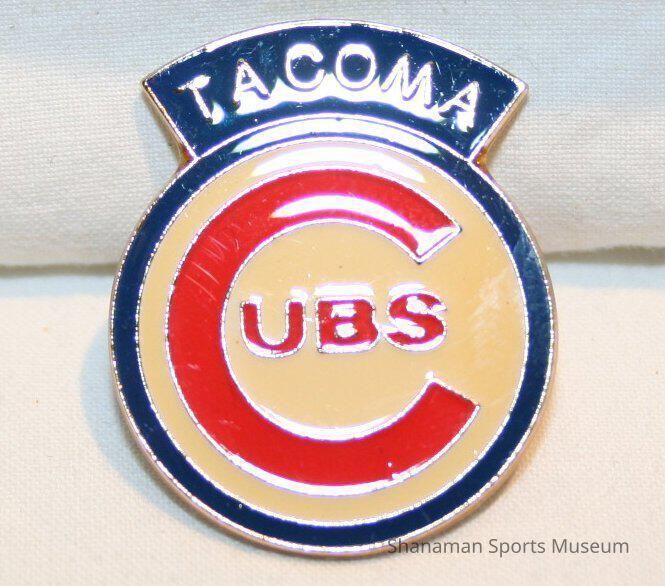 Here is a red, white and blue commemorative pin of the Tacoma Cubs. It is made of steel with an enamel base. Tacoma's Triple-A minor league ballclub was called the Tacoma Cubs from 1966 to 1971. The Chicago Cubs used Tacoma as their Triple-A team for six seasons. Whitey Lockman managed the Tacoma Cubs for the first four years and led the team to the 1969 Pacific Coast League championship in 1969. That year the Tacoma Cubs finished with an 86-60 record and had a combined pitching ERA of 3.01. The Cubs left Tacoma after the 1971 season but local businessmen Stan Naccarato and Clay Huntington helpede keep Triple-A baseball in Tacoma and the team became affilitated with the Minnesota Twins. They were the Tacoma Giants from 1960 to 1965 and then became the Tacoma Cubs for six seasons.