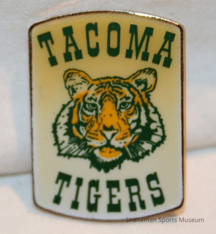 This is a commemorative pin of the Tacoma Tigers complete with green lettering and a yellow and green tiger on a white background. Tacoma's first team in the Pacific Coast League was the Tacoma Tigers and they joined the league in 1904 after moving from Sacramento. That 1904 Tiger team won Tacoma's first PCL pennant. But the next year, the Tigers moved back to Sacramento in the second half of the season.Lexicon
