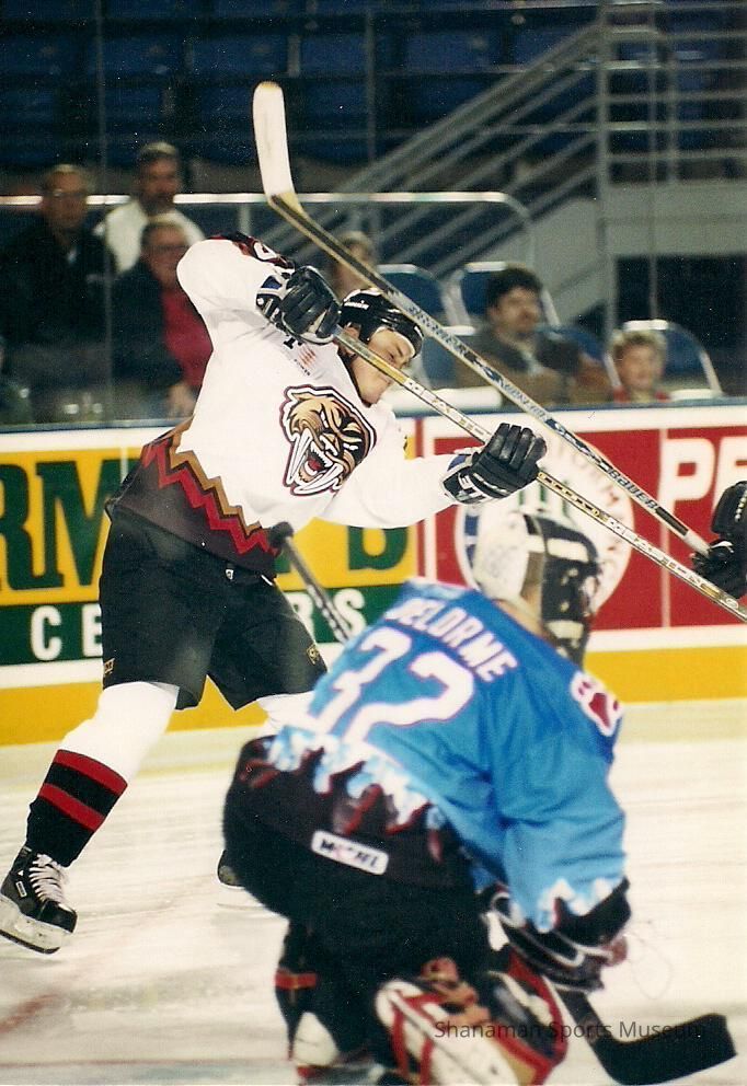 Tacoma Sabercat #4 Scott Drevitch shoots while trying to avoid getting a stick to the face during a West Coast Hockey League game at the Tacoma Dome during the 1999-2000 season. The Sabercats were a professional minor league hockey team that began playing in the 1997-88 West Coast Hockey League season and had a successful five-year run. Tacoma won the regular-season Northern Division title and reached the league finals in its first season. The Sabercats lost to the defending champion San Diego Gulls in the league’s first Taylor Cup. The following season, the Sabercats returned to the playoffs after winning the Northern Division title again and this time defeated the Gulls in the Cup finals in the 1998-99 season. It would be the only league championship for the franchise, which folded after the 2001-02 season. The Sabercats made the playoffs all five seasons, winning three division championships as well.Made/Created