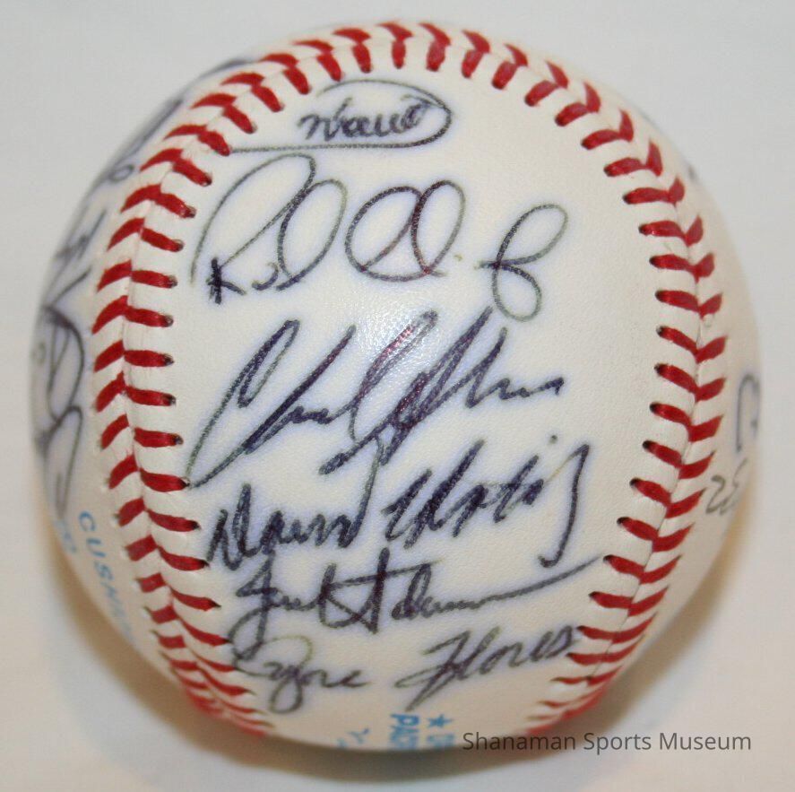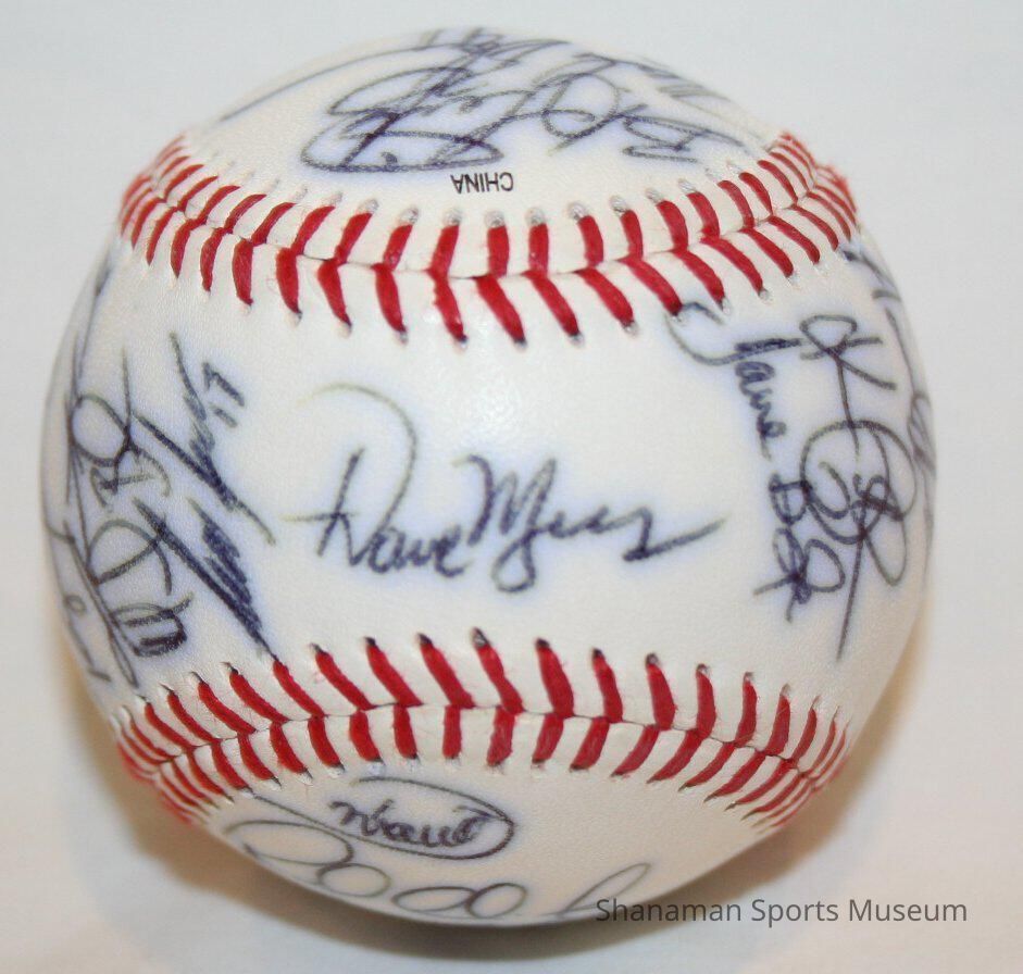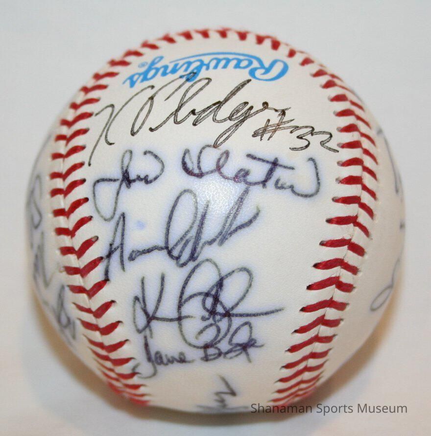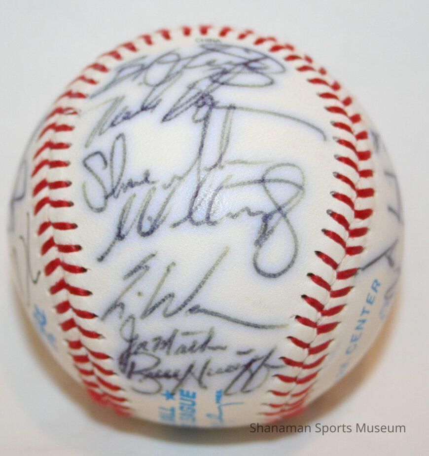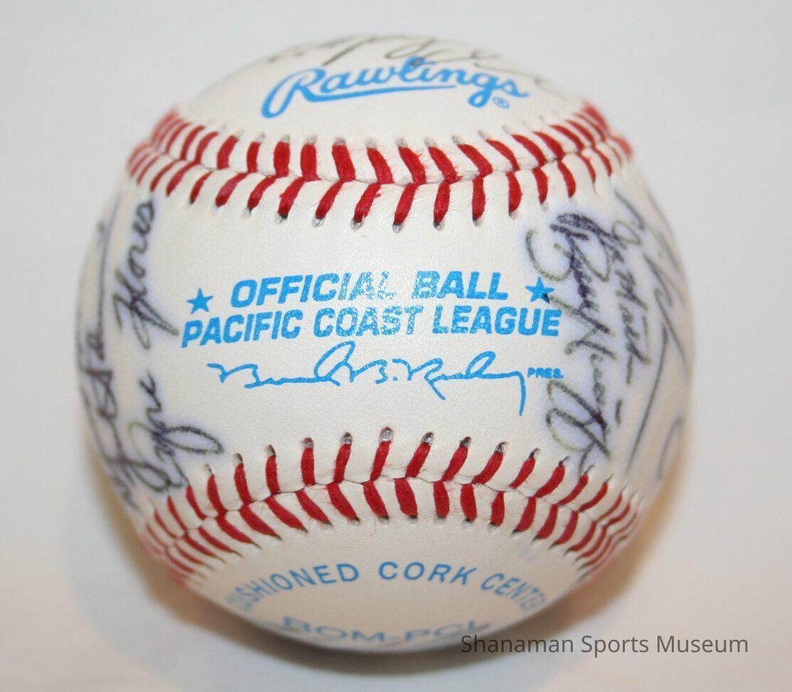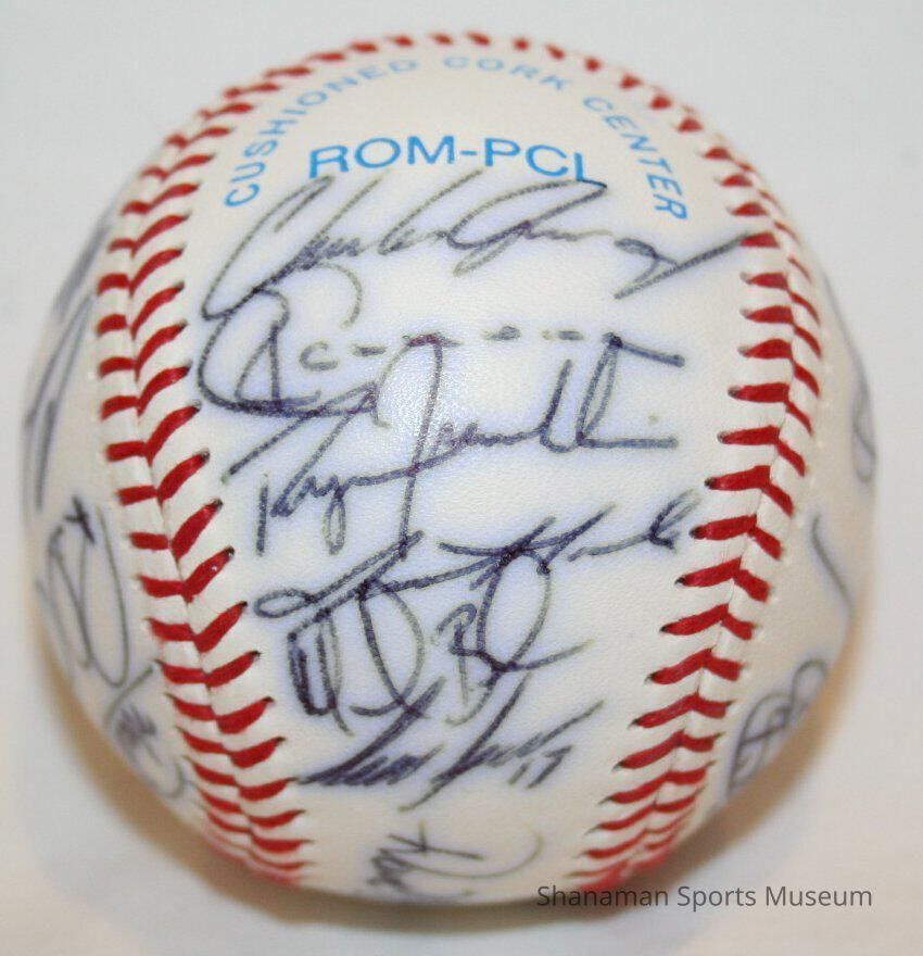 Tacoma Rainiers baseball, signed by multiple members of the 1999 Tacoma Rainiers. All signatures in blue ink, except one in black permament marker. "Rawlings Offical Ball Pacific Coast League"Lexicon