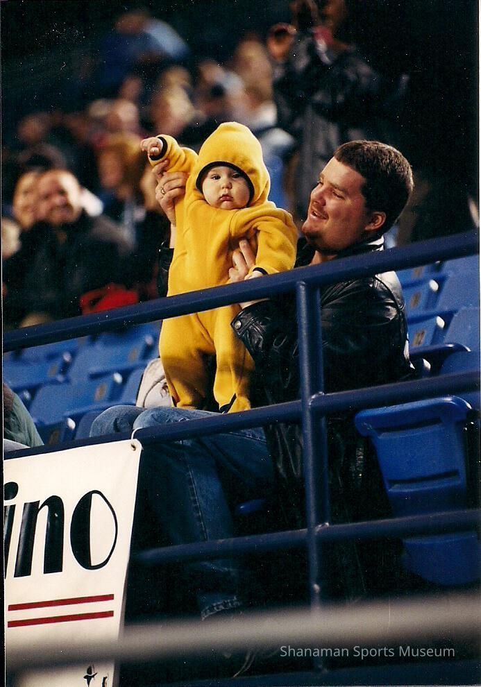 A fan holds up his young child at a Tacoma Sabercats hockey game at the Tacoma Dome during the 1999-2000 season. The Sabercats were a professional minor league hockey team that began playing in the 1997-98 season. Tacoma won the regular-season Northern Division title and reached the league finals in its first season. The Sabercats lost to the defending champion San Diego Gulls in the league’s first Taylor Cup. The following season, the Sabercats returned to the playoffs after winning the Northern Division title again and this time defeated the Gulls in the Cup finals in 1998-99. The Sabercats were the 1998-1999 WCHL Taylor Cup Champions. It would be the only league championship for the franchise, which folded after the 2001-02 season. The Sabercats made the playoffs all five seasons winning three division championships as well.Made/Created