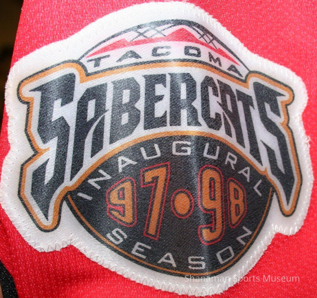 The jersey has a "Tacoma Sabercats Inaugural Season 97-98" sleeve patch.