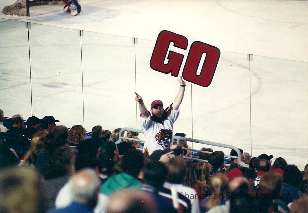 A Tacoma Sabercats fans holds up a sign during a game in the 1999-2000 season at the Tacoma Dome. The Sabercats were a professional minor league hockey team that began playing in the 1997-88 season and had a successful five-year run. Tacoma won the regular-season Northern Division title and reached the league finals in its first season. The Sabercats lost to the defending champion San Diego Gulls in the league’s first Taylor Cup. The following season, the Sabercats returned to the playoffs after winning the Northern Division title again and this time defeated the Gulls in the Cup finals. It would be the only league championship for the franchise, which folded after the 2001-02 season. The Sabercats were the 1998-1999 WCHL Taylor Cup Champions. The Sabercats made the playoffs all five seasons, winning three division championships as well.Made/Created