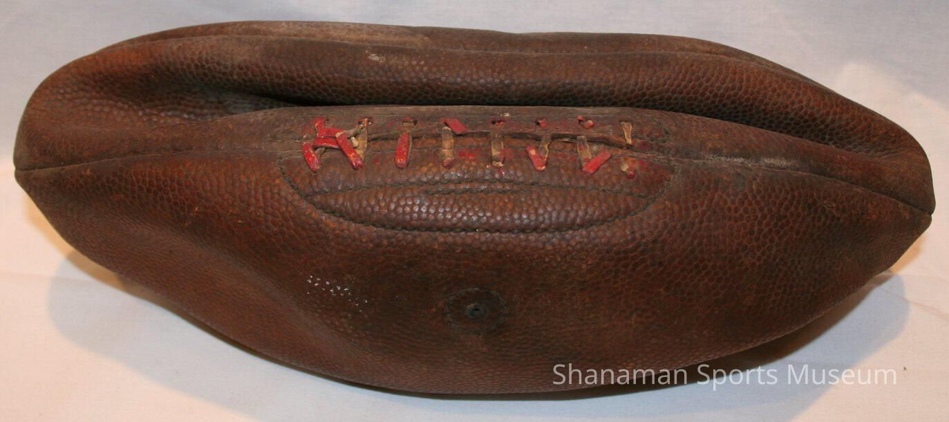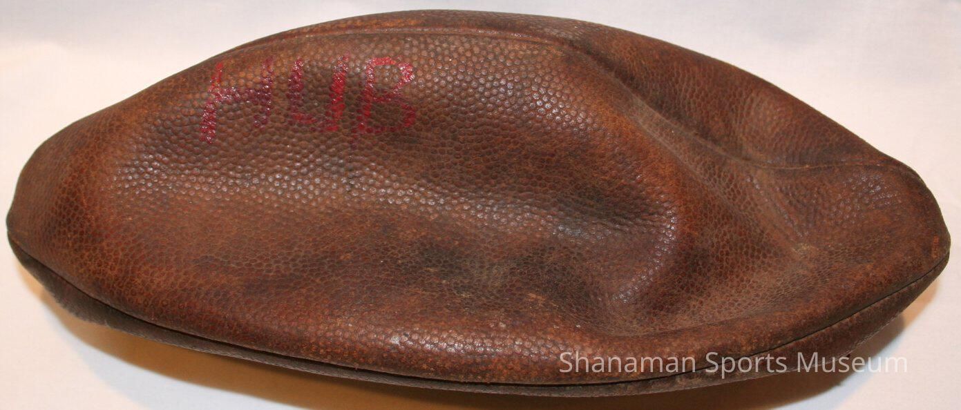 Leather football, deflated. Red painted laces visible, but fragmentary. Hand-painted in red on other side, the letters: HUB
