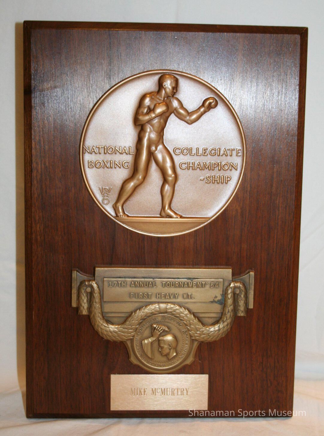 A wooden plaque signifies the championship of “Irish” Pat McMurtry. The boxer was homegrown, a legitimate title contender and potential heavyweight champion. McMurtry, a Tacoma native who won the NCAA heavyweight title in 1954, was ranked fifth among the world’s heavyweight. One of his biggest career highlights was a decision over George Chuvalo at Madison Square Garden in 1958, in which he wore these boxing shorts. McMurtry, who had a career record of 33-4-1, was inducted into the Washington State Sports Hall of Fame and the Tacoma-Pierce County Sports Hall of Fame.