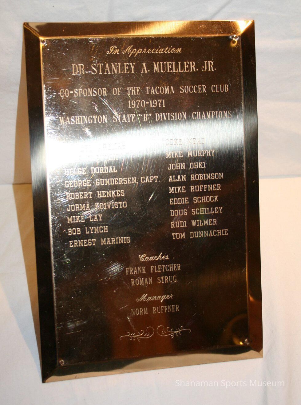 A plaque, now missing the original base, was presented to Dr. Stanley Mueller Jr., the co-sponsor of the Tacoma Soccer Club in 1970-71.