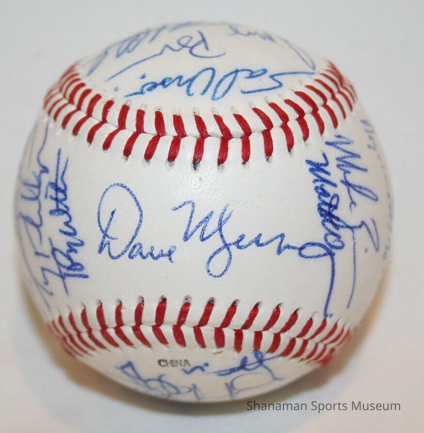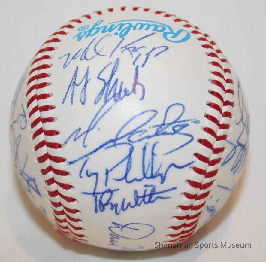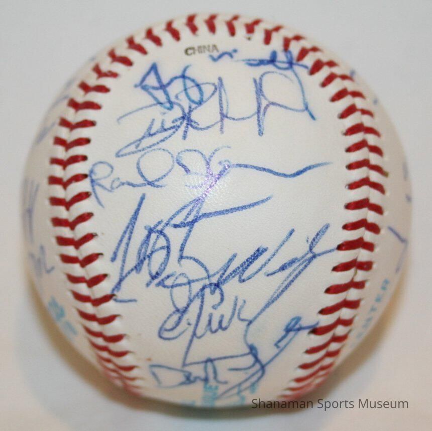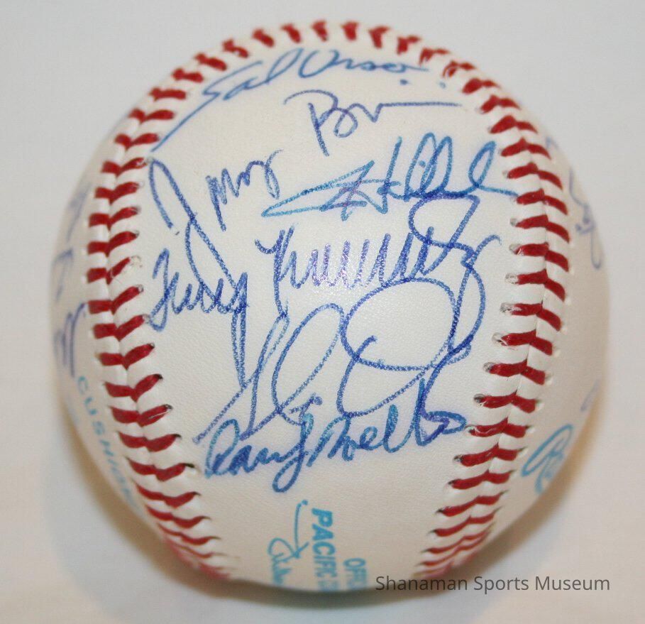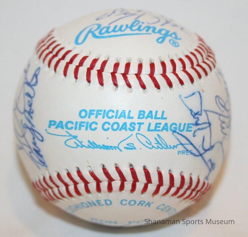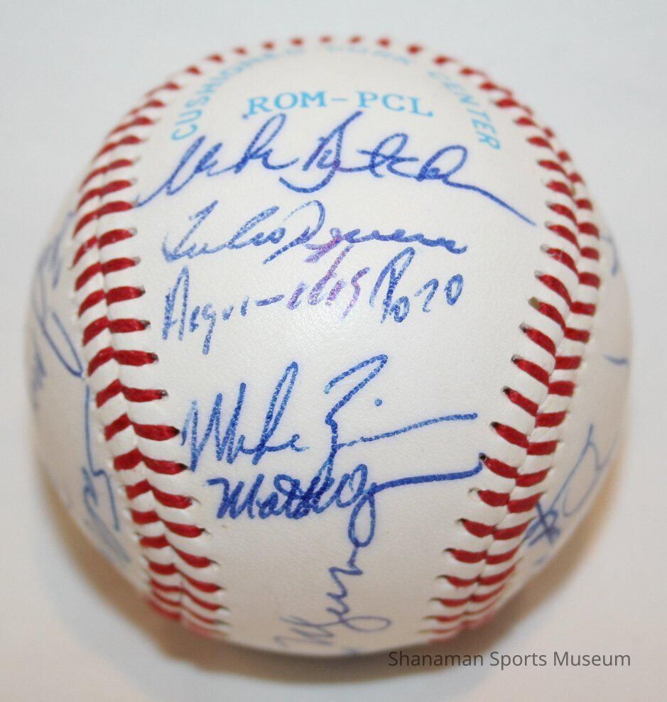 Rawlings Official Baseball for the Pacific Coast League signed in blue ink by multiple members of the 1996 Tacoma Rainiers. The 1996 squad – the AAA affiliate for the Seattle Mariners – finished the year with a 69-73 record under the leadership of manager Dave Myers. The 1996 squad featured several Mariners prospects that would be remembered more for disastrous trades than their impact at the MLB level for the Seattle team. Jose Cruz, Jr., played 22 games for the Rainiers in 1996 as a 22-year-old outfielder, slugging .539 with a .383 on base percentage. On the mound, 23-year-old Derek Lowe was one of Tacoma’s top starters with six wins and 105 innings pitched. Bob Milacki led the pitching staff that year with 13 wins, a 2.74 earned run average and five complete games in 164 innings pitched. Jim Bonnici led the offense with an .866 on base-plus-slugging percentage in a team-high 562 plate appearances, batting .292 with a team-best 26 home runs. Notable future Mariner Raul Ibanez batted .284 in 456 plate appearances at 24 years of age. A 20-year-old Alex Rodriguez appeared in two games for the Rainiers that year, while future Mariners, Toronto Blue Jays and Texas Rangers manager Don Wakamatsu appeared in one game.