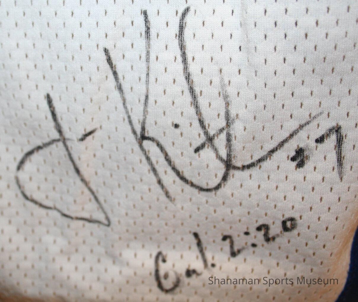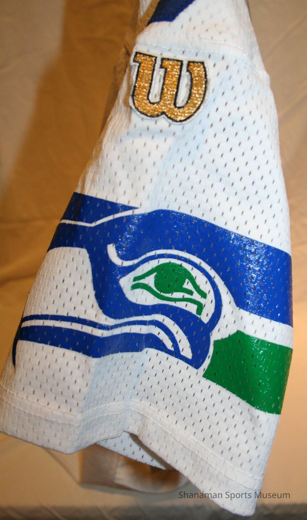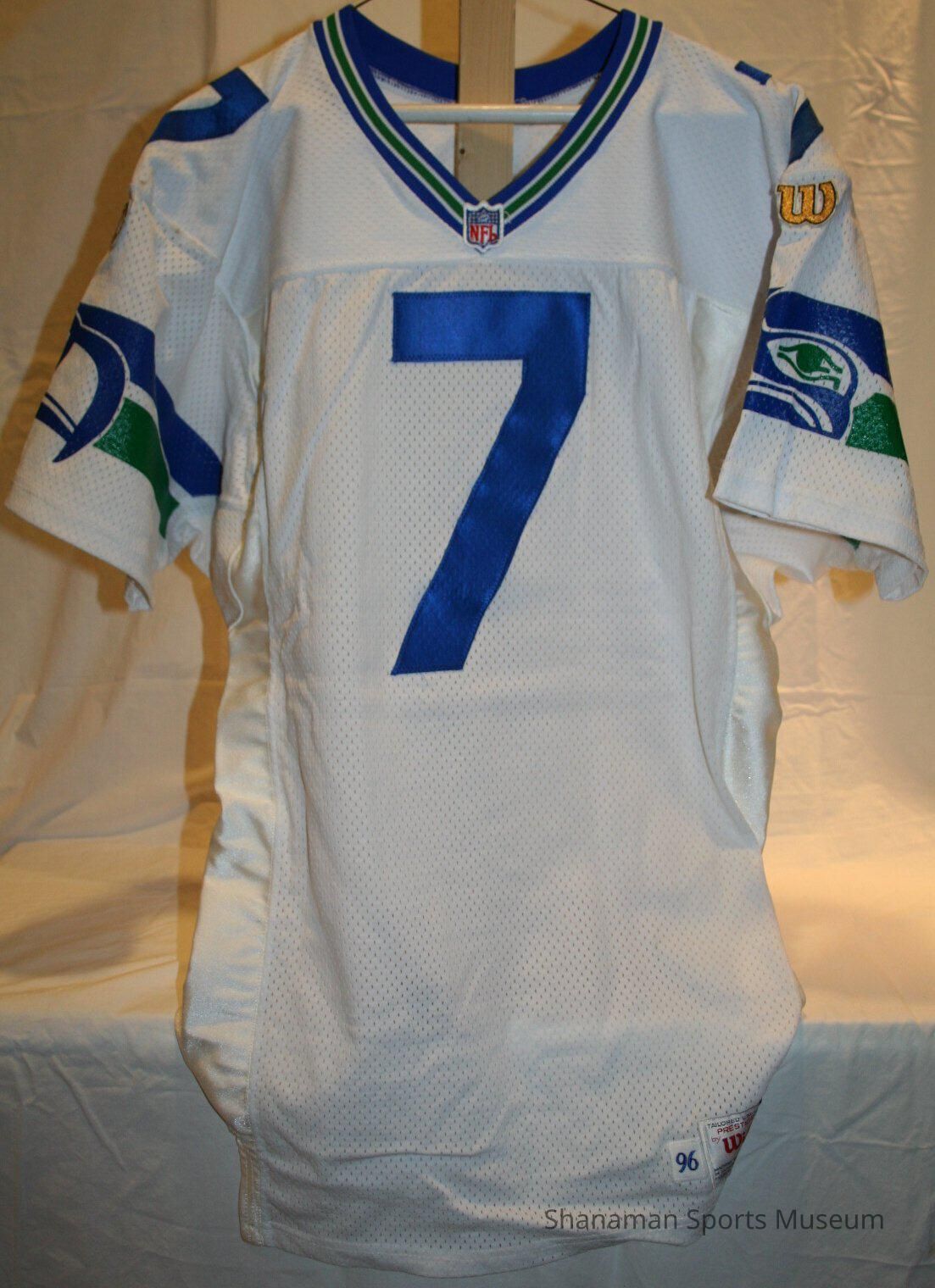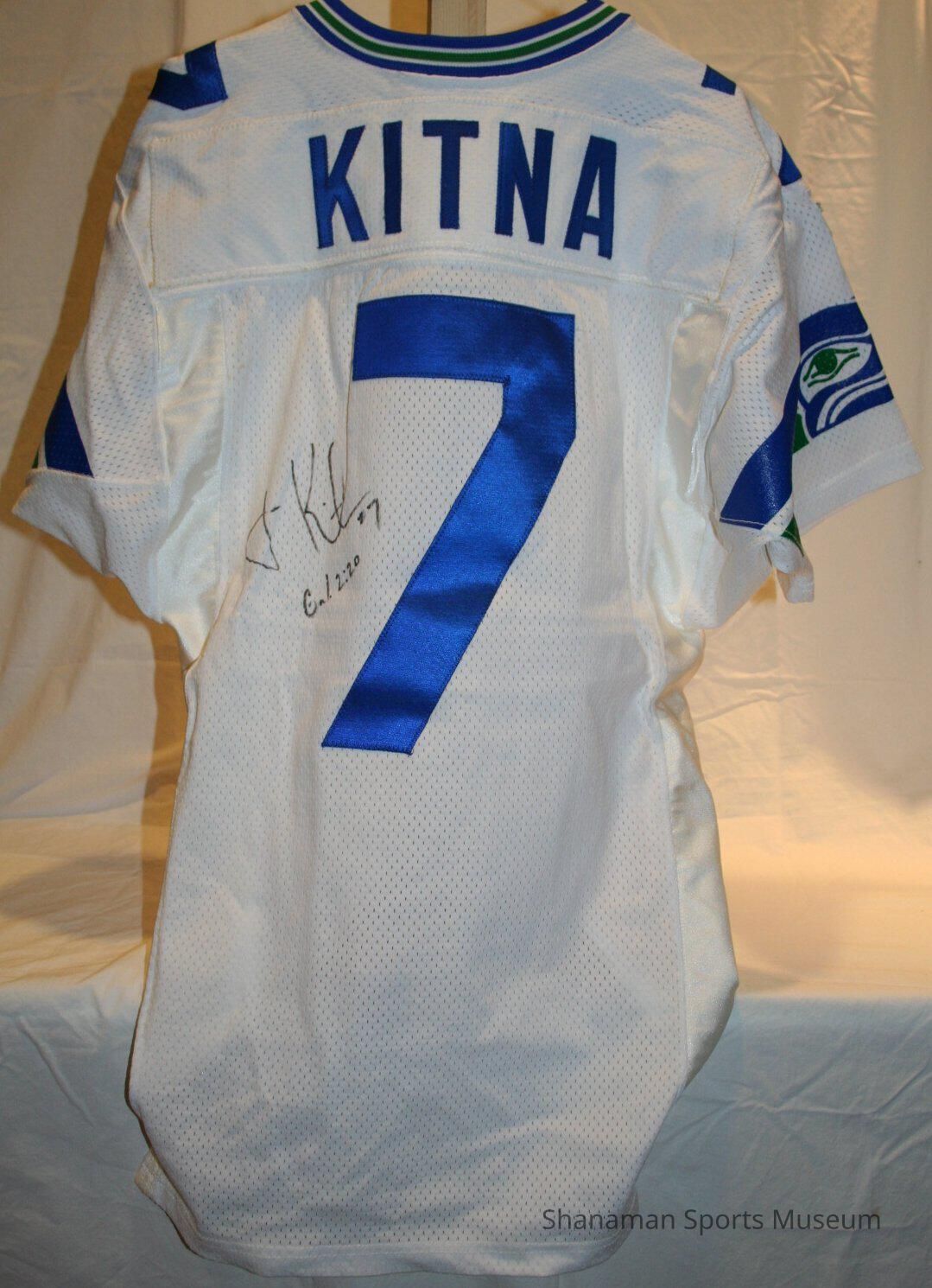 This away jersey was worn by former Seattle Seahawks quarterback Jon Kitna. Kitna was a standout player at Lincoln Highschool in Tacoma, where his talents and hard work earned him a walk-on spot on the Central Washington University football team. Kitna bounced around the NFL, spending time in Seattle, Cincinnati, Detroit, and finally retiring as a Dallas Cowboy. The Jersey itself has a blue seven which was Kitna’s number, along with “Kitna” above the seven on the back. The Seahawks logo used from 1976-2001 rests on either shoulder, along with the Wilson label on the left shoulder. Kitna’s signature is on the bottom of the jersey signed in black, with the bible verse “Gal 2:20”.Lexicon