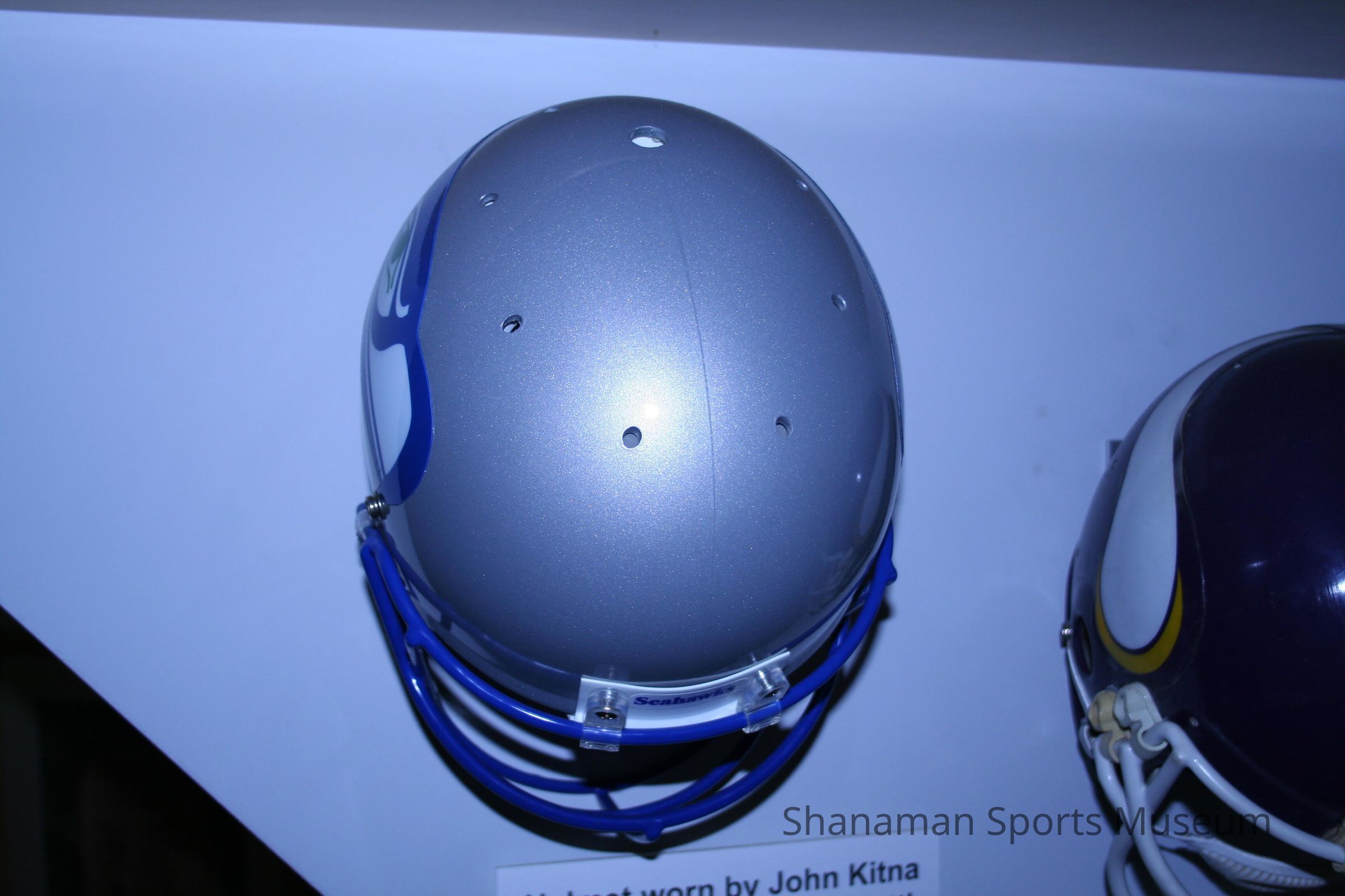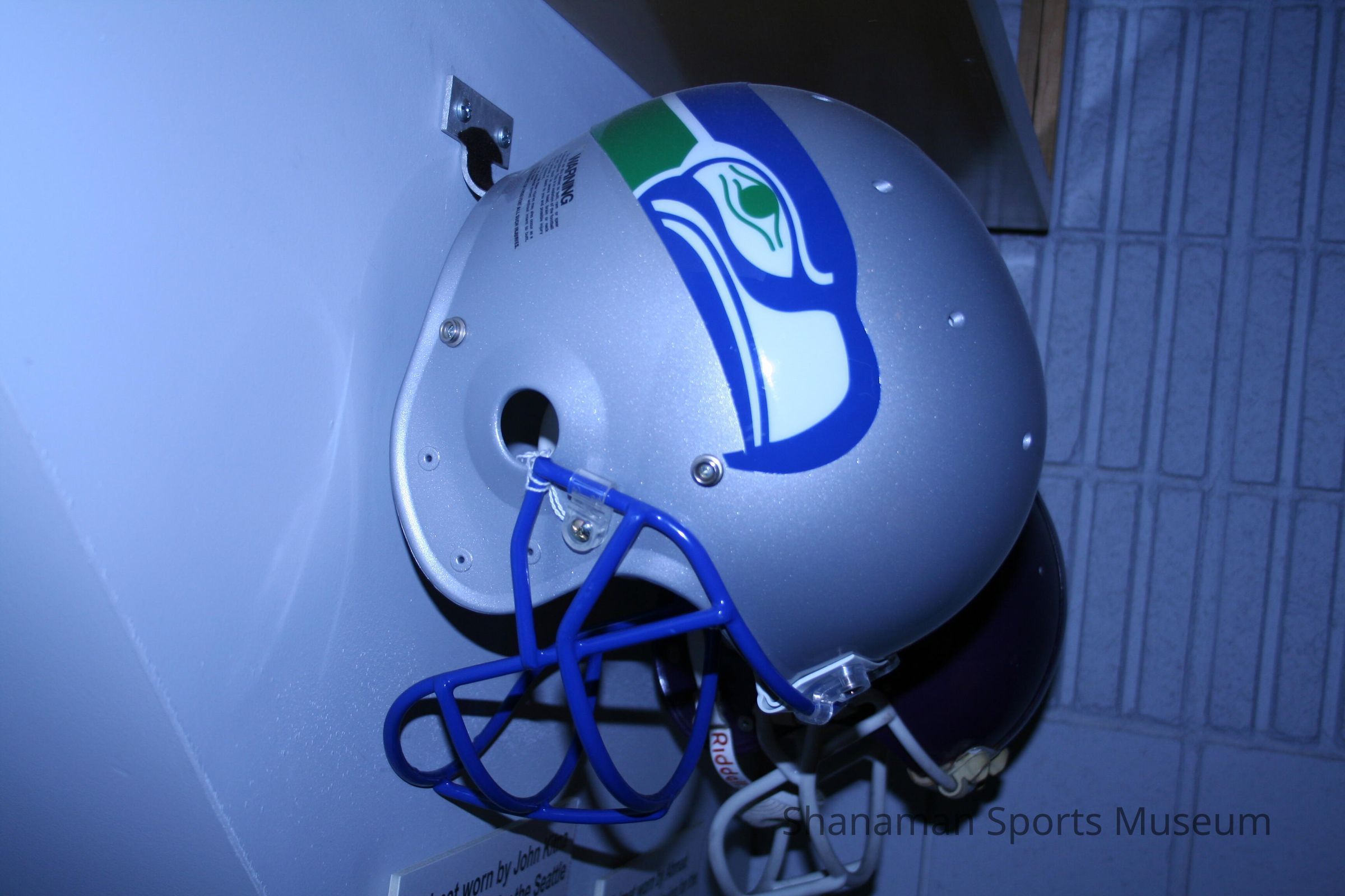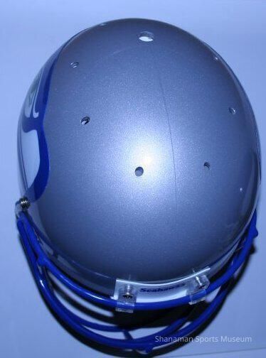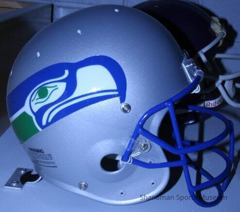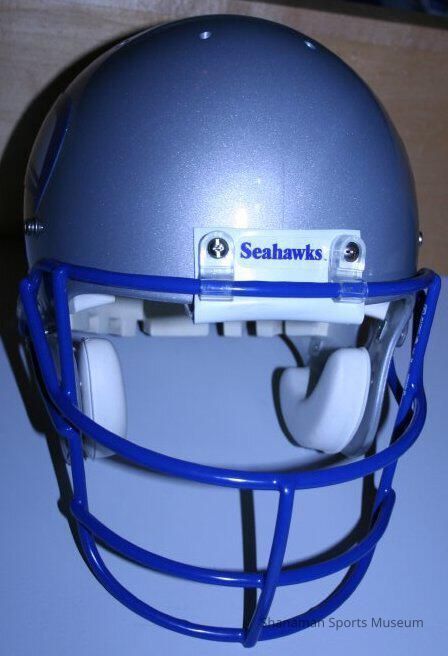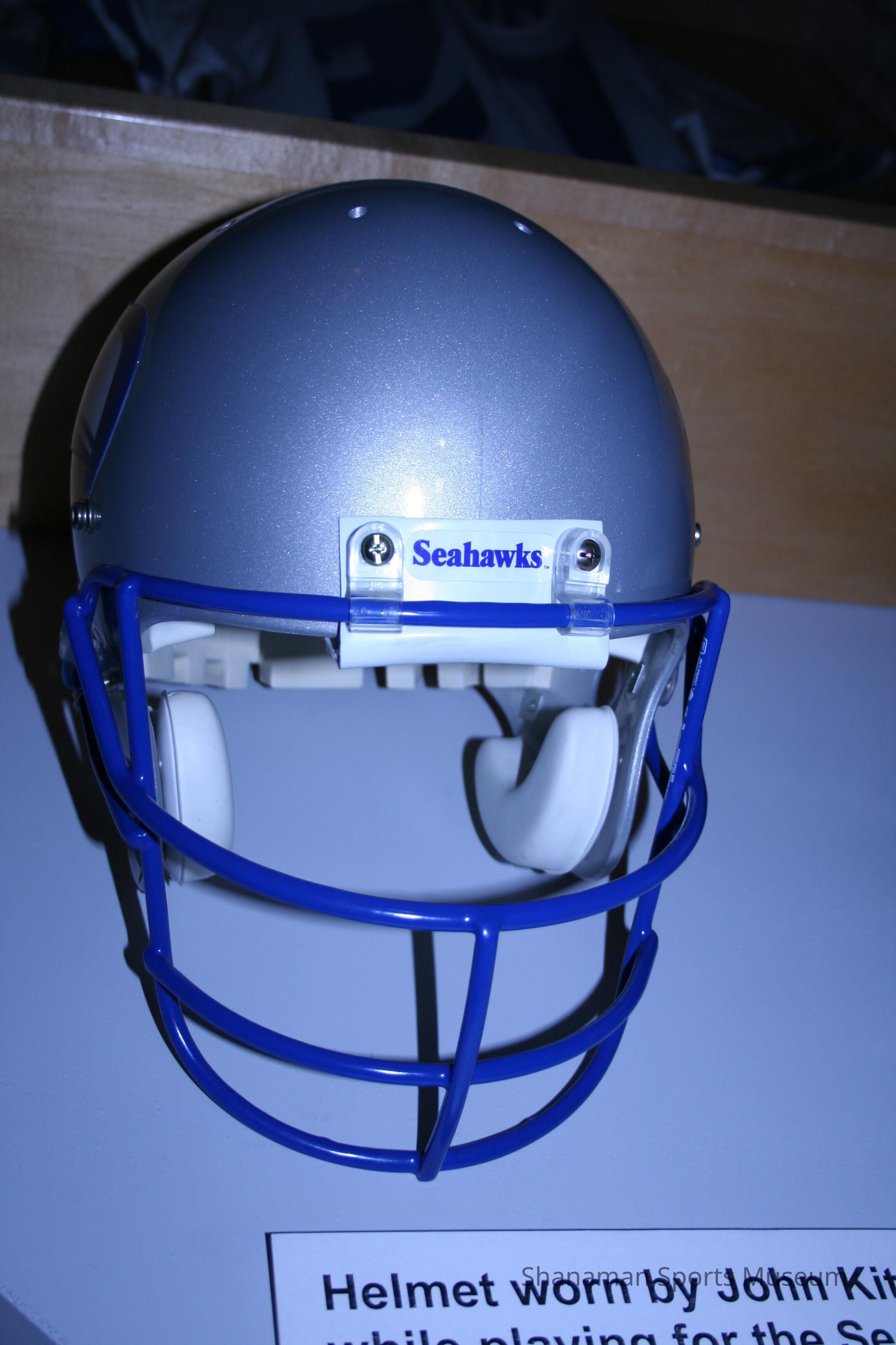 This helmet was worn by former NFL quarterback Jon Kitna. The helmet is a nice silver with the logo that Seattle used from 1976-2001 on either side. Just above the blue facemask is the word “Seahawks”. The number “7” is printed inside, near the left ear hole, but the helmet is in such great condition that it almost seems untouched. The silver helmet with a blue facemask (as seen here) was worn by the team from 1983 to 2001, matching well with Seattle’s blue home and, white away Jerseys. Jon Kitna attended Lincoln Highschool in Tacoma where he was a standout player in Football, Basketball and Baseball. His hard work earned him a walk-on spot at Central Washington University and the starting quarterback job his freshman year. He saw a long professional career, spending four years with Seattle splitting playing time with former UW star Brock Huard. Kitna left the NFL to play overseas in Europe, where he led the Barcelona Dragons to the World V Championship. Kitna retired as a Dallas Cowboy in 2011 after spending time in Cincinnati as a Bengal, and Detroit as a Lion.Lexicon