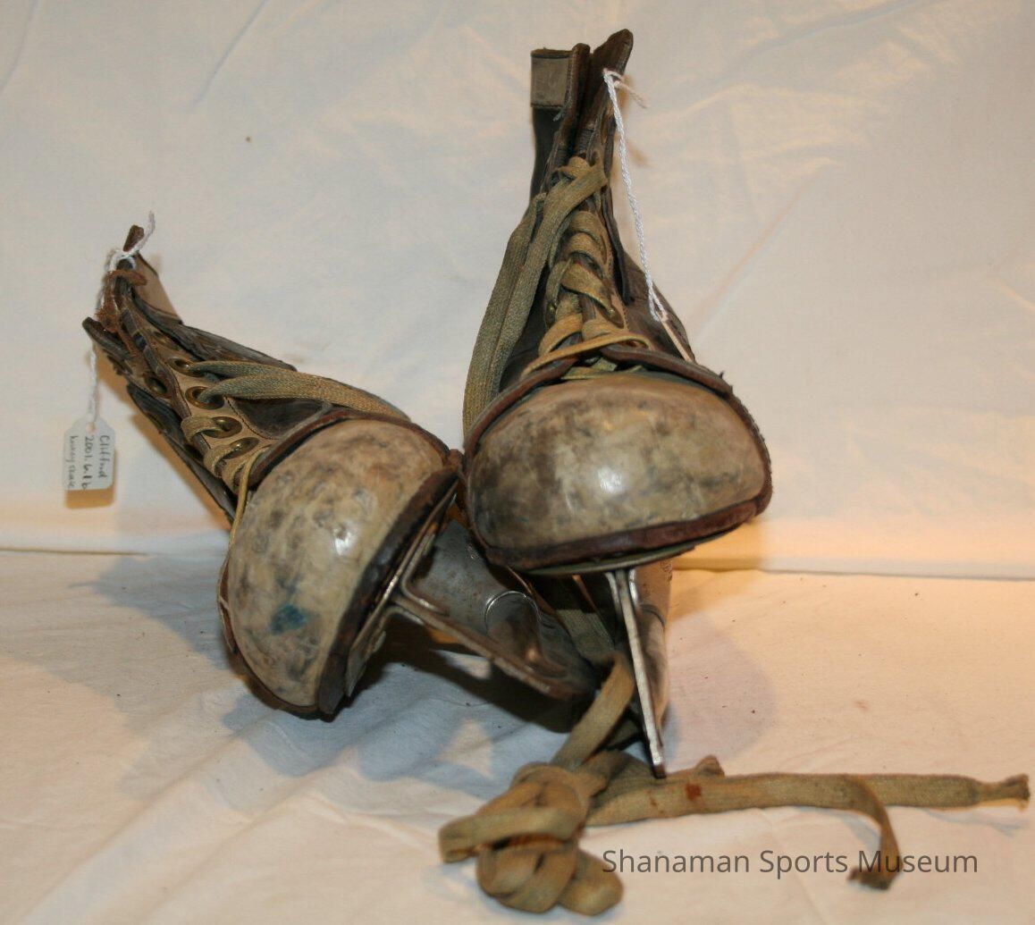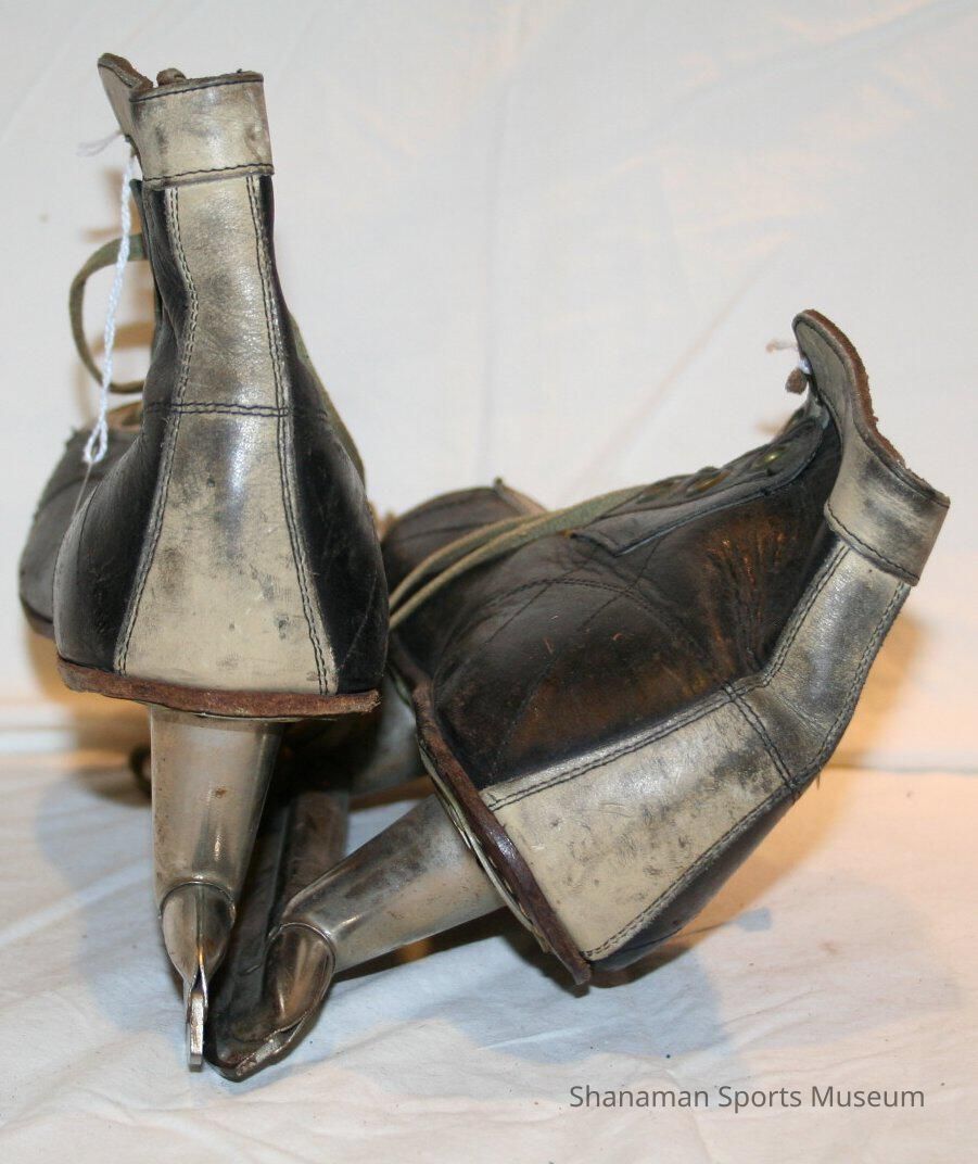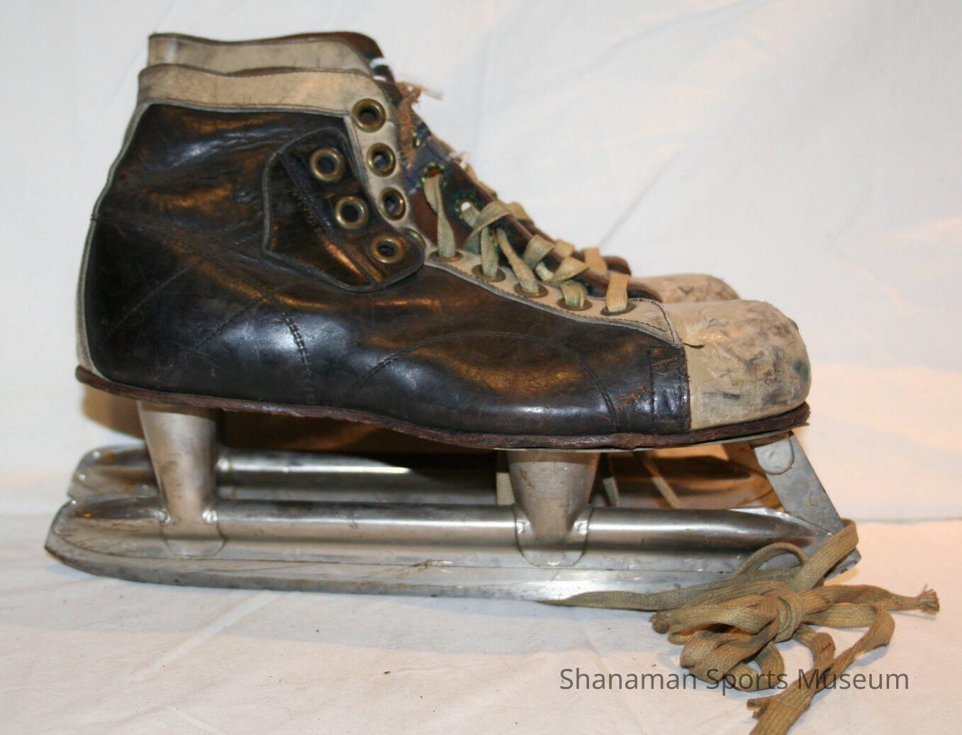 A pair of black leather ice hockey skates feature Union Hardware Comp stamped above the blades.