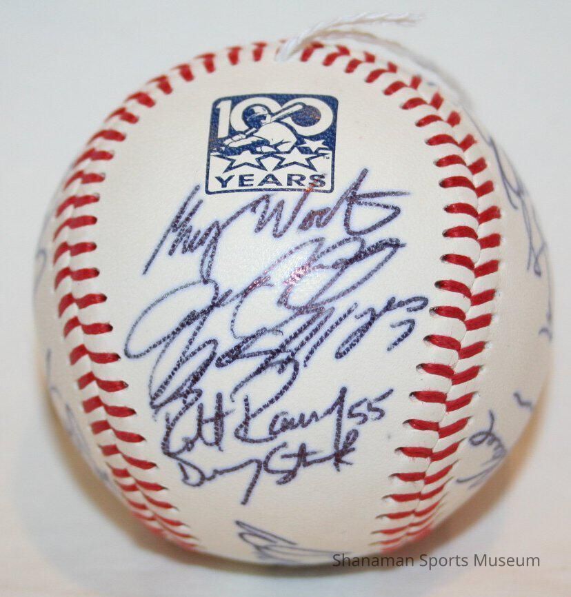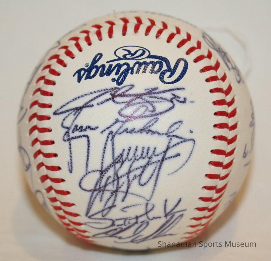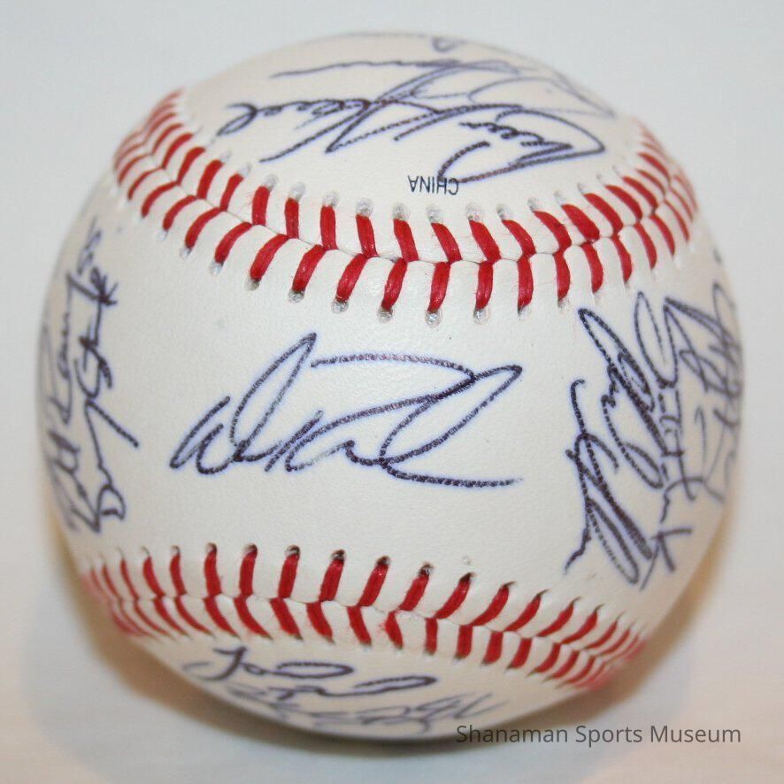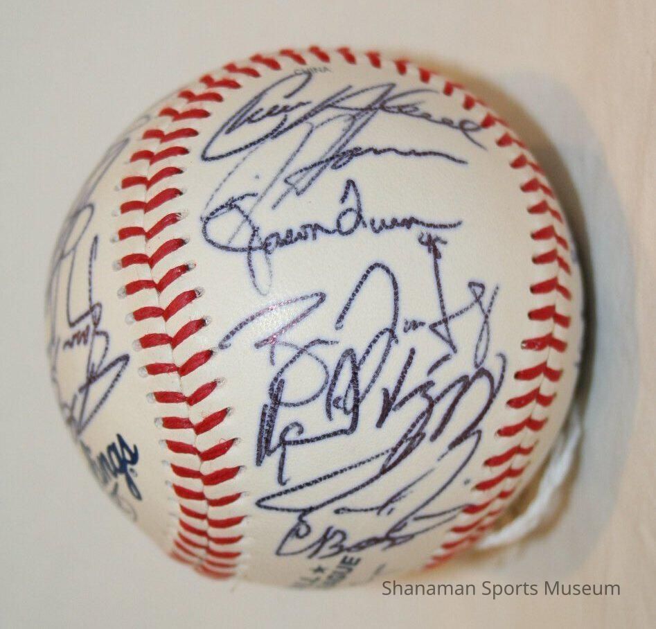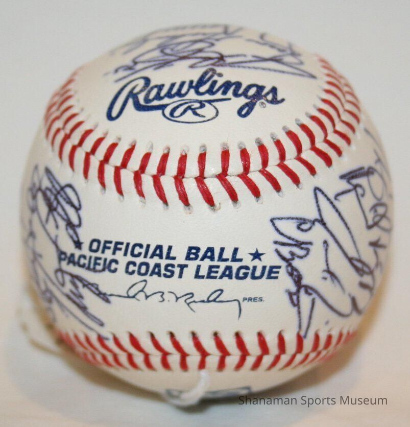 Rawlings Official Baseball for the Pacific Coast League signed in black ink by multiple members of the 2001 Tacoma Rainiers. The 2001 squad – the AAA affiliate for the American League West champion Seattle Mariners – finished the year with an 85-59 record under the leadership of manager Dan Rohn, winning the North Division title by 12.5 games over the Calgary Cannons. Mariners prospect Denny Stark led the league with 14 wins and ranked third with a 2.37 earned run average, while 22-year old prospect Joel Pineiro won six games in 77 innings pitched while spending half the season helping the Mariners tie a Major League Baseball record with 116 wins. Brett Tomko threw a no-hitter on July 3 for the Rainiers, while four days later John Halama threw the first nine-inning perfect game in Pacific Coast League history against Calgary. Todd Betts led the offense with a .308 batting average and 156 hits, while Juan Thomas slugged 23 home runs with 95 runs batted in and posted a .523 slugging percentage.