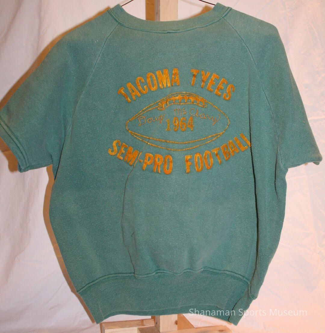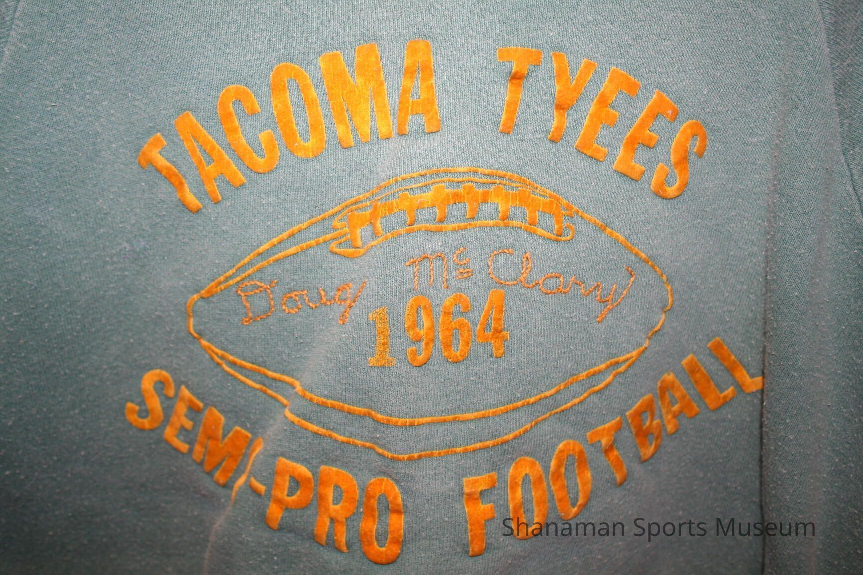 This green short sleeve sweatshirt, has “TACOMA TYEES SEMI-PRO FOOTBALL” imprinted in yellow, an outline of a football in the middle of the chest, and “1964” printed inside. With “Doug McClary written in cursive just above the date. The Tacoma Tyees (now the Tacoma Sabers) have been a big part of Pierce county football, with Semi-Pro first finding its way into Western Culture in the 1930’s.The Tacoma Tyees were founded in 1962 under Founder, General Manager, and Coach Ben Hounder. The Tacoma Tyees joined the Northwest Semi-Pro league, playing local teams like Portland, Seattle, Eugene, Spokane, and Bellingham. They would play Sundays at Bellarmine field, or the Lincoln Dome. The Tyees won the league championship in 1965, but with the recent founding of the Continental Football League and the Pierce County Bengals, the Tyees soon were forced to cease operations.Lexicon