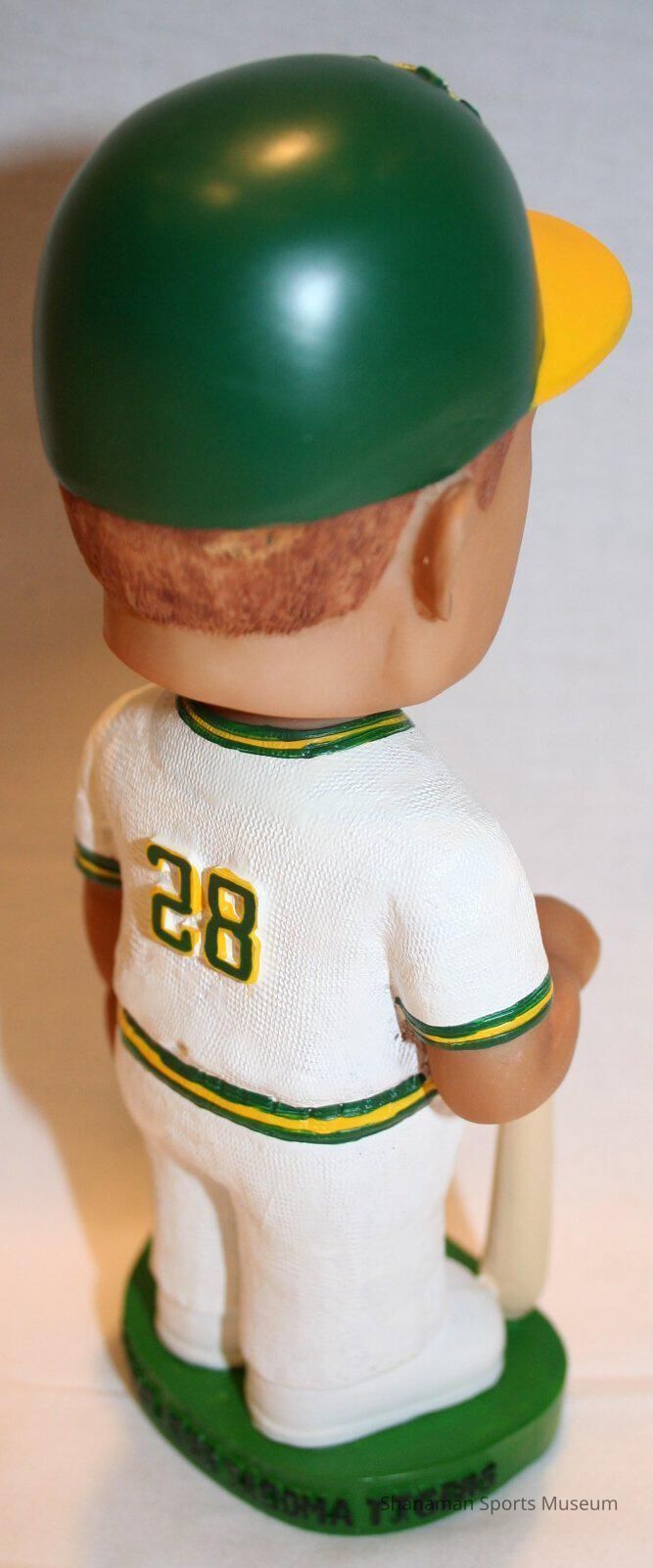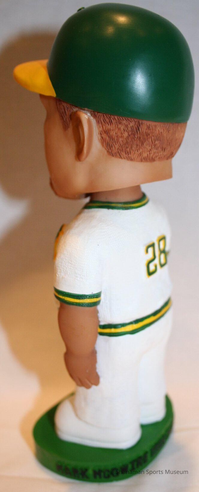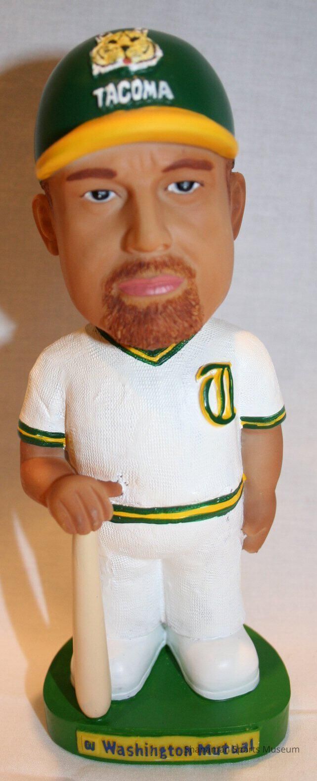 Here is a bobble head doll of Mark McGwire wearing a white, green and yellow uniform of the Tacoma Tigers. After playing for the Tigers, McGwire would go on to be the American League's rookie of the year while playing for the Oakland A's in 1986. He played first base in the major leagues from 1986 to 2001, playing for the Oakland A's and St. Louis Cardinals. He won a World Series playing for the A's in 1989 and then while coaching with St. Louis in 2011. McGwire is one of the most prolific home run hitters in MLB history. He once held the record for the most homers in a season with 70, which he hit in 1998.Lexicon