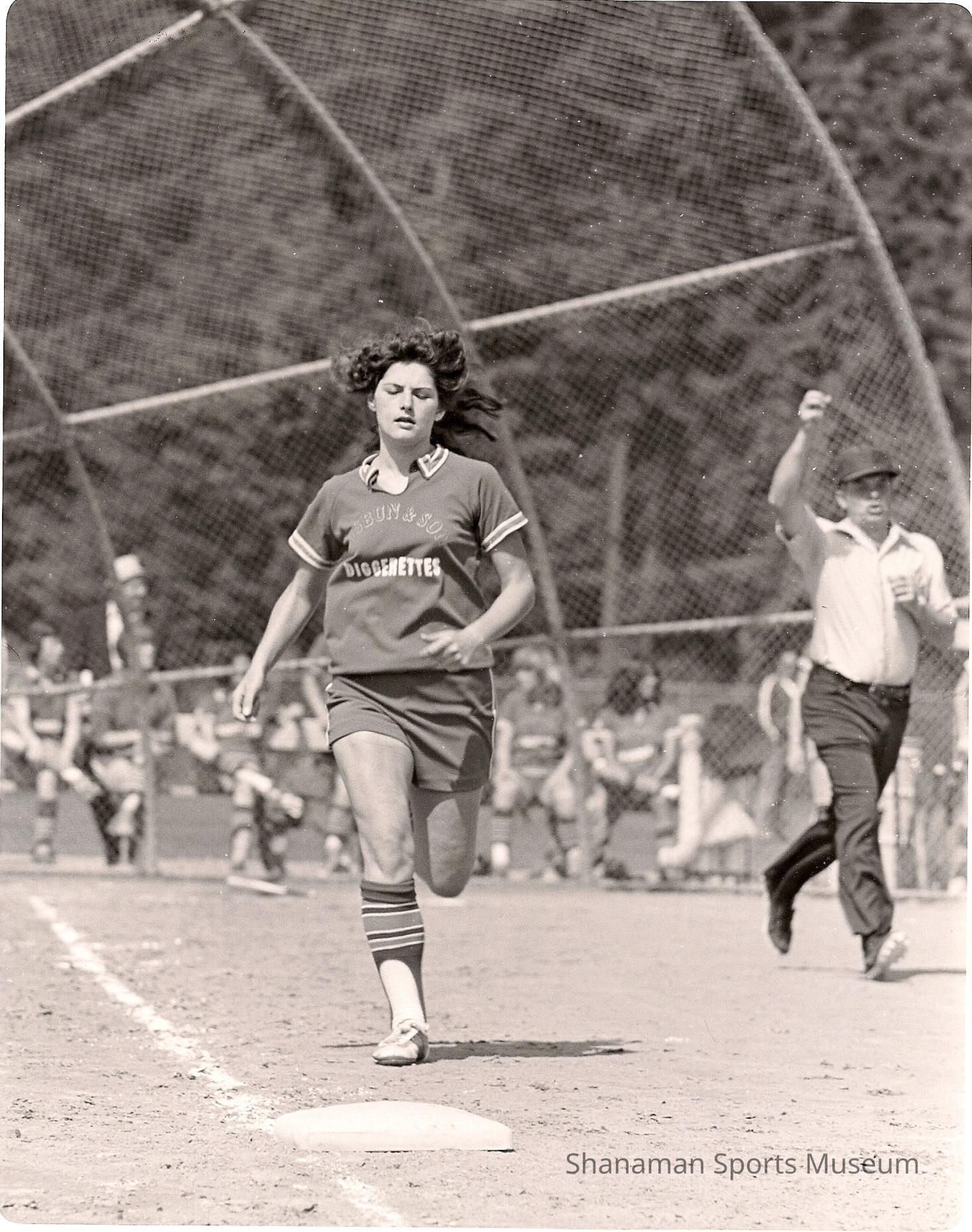 Photograph, b/w of female softball player running to a base. Umpire running behind her is Tom Slee.Lexicon