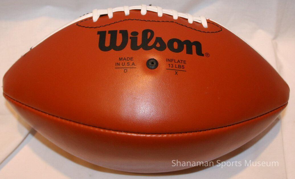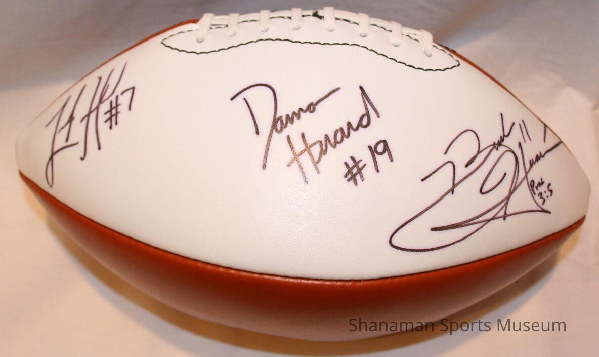 A Wilson football is signed in black felt pen by the Huard brothers of Puyallup, Luke (No. 7), Damon (No. 19) and Brock (No. 11).