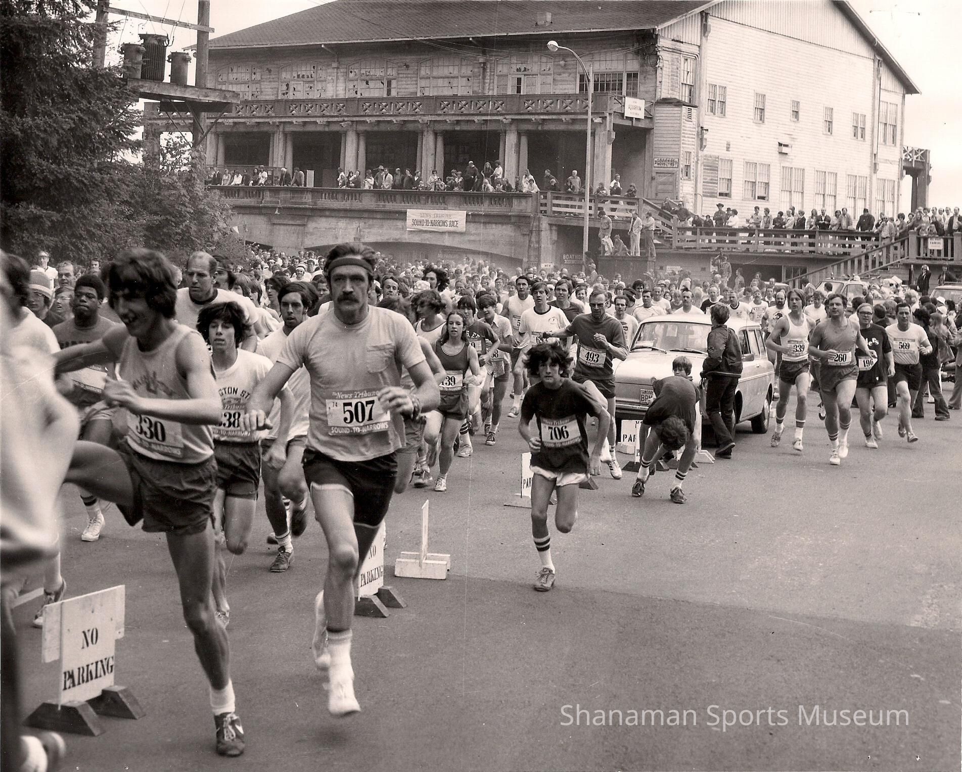 Photograph, b/w of the 1974 Sound to Narrows fun run leaving from the Point Defiance Boathouse.