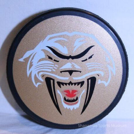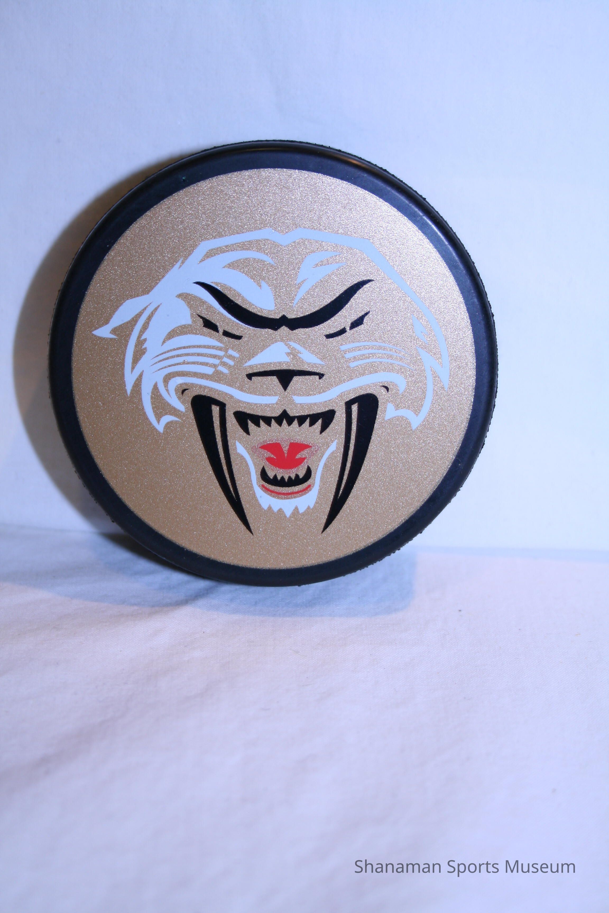 A promotional giveaway hockey puck has a Tacoma Sabercats alternate logo in white, black and red on gold background. The Sabercats played in the West Coast Hockey League from 1997-2002.