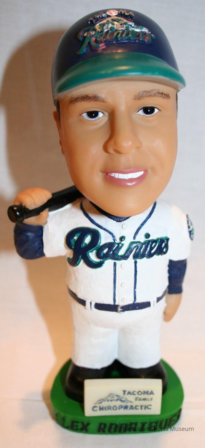 Here is a bobble head figure of Alex Rodriguez wearing a Tacoma Rainiers white home uniform. Rodriguez briefly played for the Rainiers and went onto an all-star career in the major leagues, playing for the Seattle Mariners, Texas Rangers, and New York Yankees. The Mariners selected Rodriguez first overall in the 1993 MLB draft and he debuted in the major leagues the next year at the young age of 18 and briefly returned to the minor leagues. He was named the league MVP in 2005 and 2007. In 2007, he became the youngest player to hit 500 home runs in a career. The photo was a promotional item for the Tacoma Family Chiropractic.Lexicon