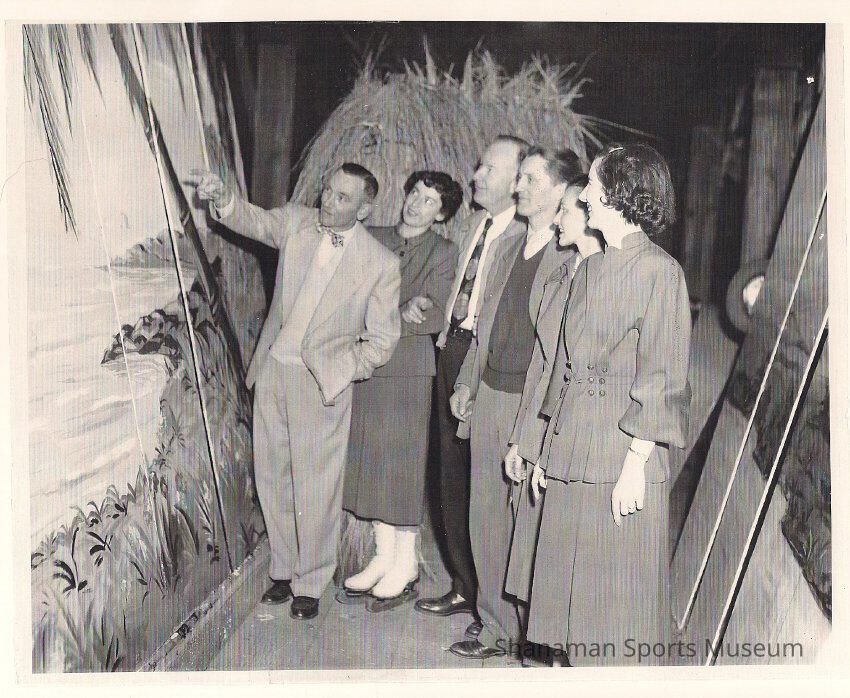 Skating fans, including Ray Campbell (third from left) and John Johnson (fourth from left) admire a back drop for an ice skating show, circa 1950. The Ice Follies were the precursor to the Ice Capades which featured elaborate production numbers and costumes and later include several Olympians and world champion skaters. By 1955 the show had eight performances and 175 skaters. The rink also became the entertainment hub for Tacoma area residents since its opening in 1938 and continued until 1982 when part of the building collapsed and the rest was demolished.