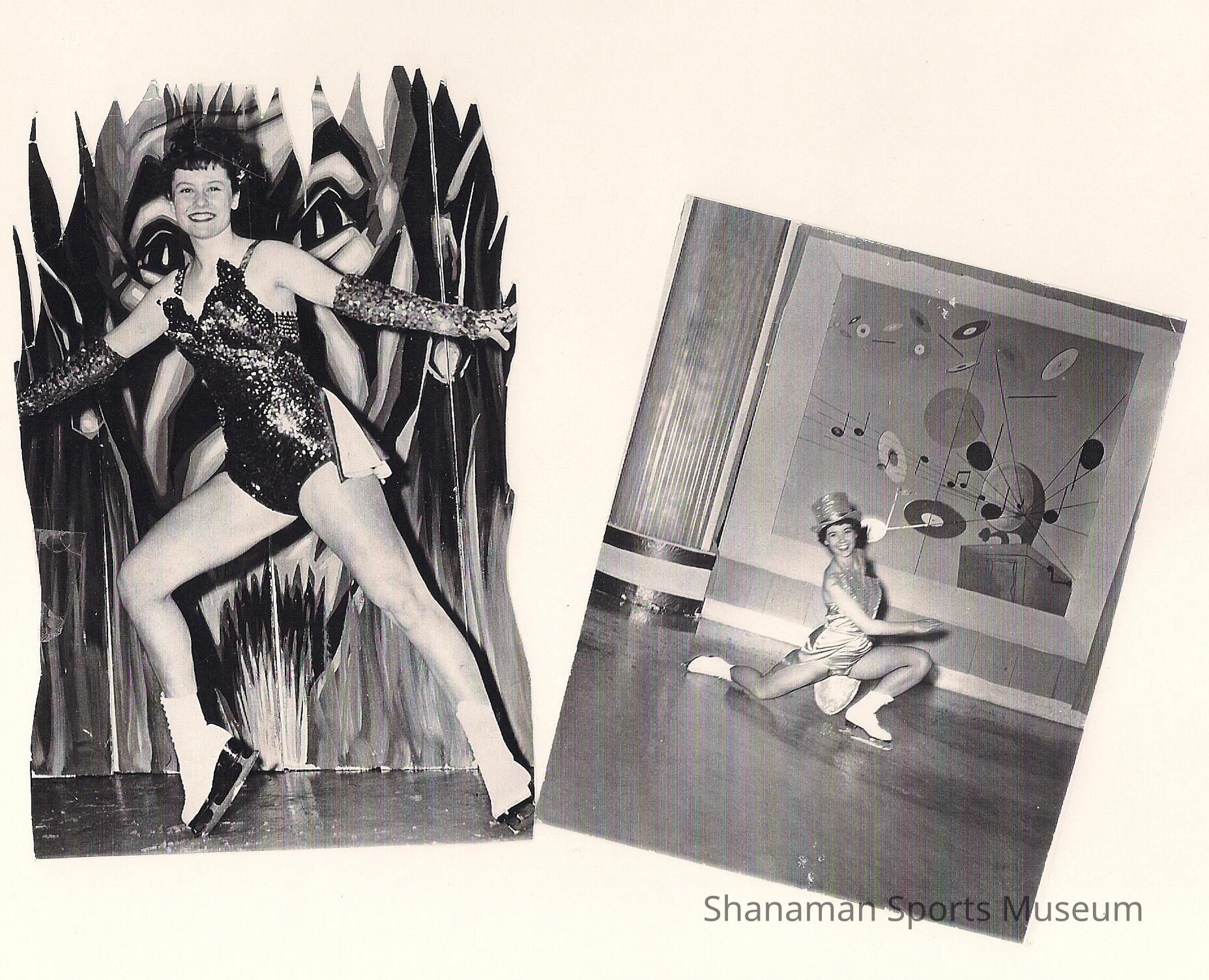 Skaters and Ice Follies performers Joby Moore and Leilani Sims are shown in costume in front of an ice skating back drop. The Ice Follies were the precursor to the Ice Capades which featured elaborate production numbers and costumes and later include several Olympians and world champion skaters. By 1955 the show had eight performances and 175 skaters. The rink also became the entertainment hub for Tacoma area residents since its opening in 1938 and continued until 1982 when part of the building collapsed and the rest was demolished