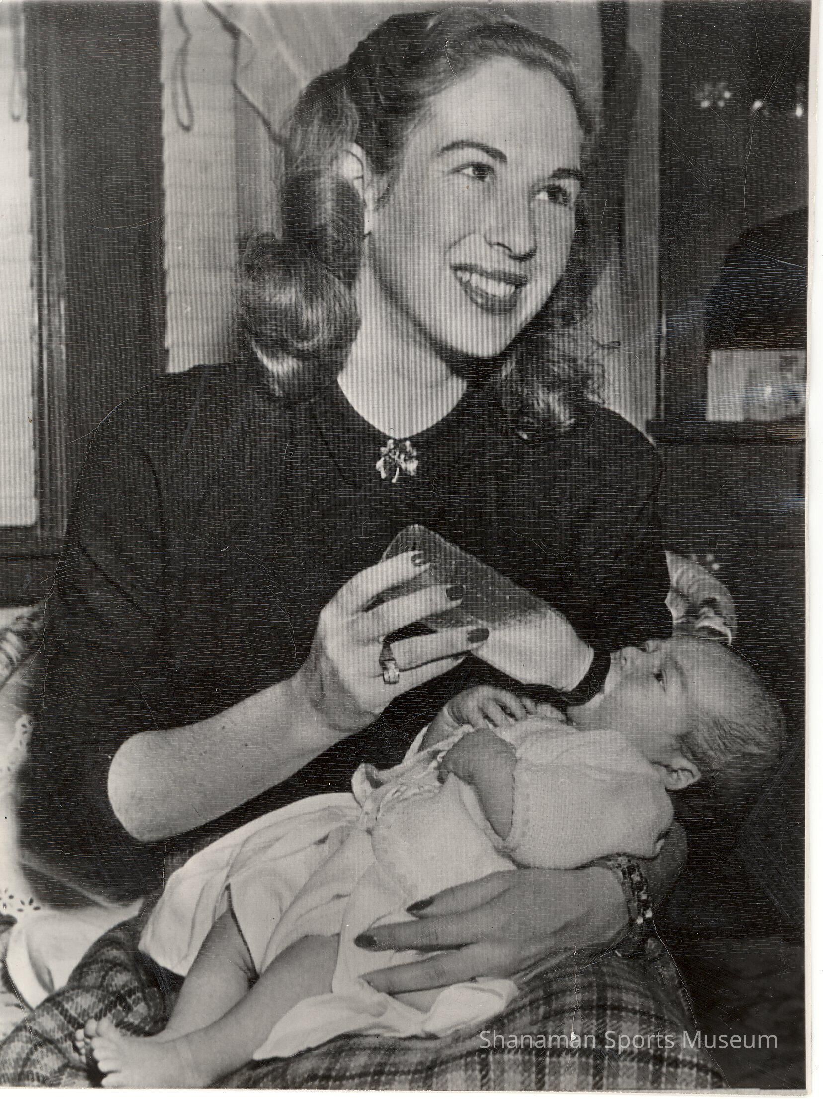 This is a black-and-white photo taken in 1943 of Gretchen Fraser, who was the first American ever to win a gold medal in the alpine combined event at the Olympics. She is feeding her 3-week-old son, Donald William Jr., in Vancouver, Washington, on Jan. 19, 1943. William's humorist birth announcement read “an applicant for the 1964 Olympics.” Fraser, who was born in Tacoma in 1919, became known as America's Lady of Skiing. In 1940, she made the Olympic ski team but the games were not held that year. At the 1948 Olympics, Fraser became the first American to win a gold medal in the alpine combined event. In 1939, she married Donald Fraser, who was on the 1936 U.S. Olympic ski team.Lexicon