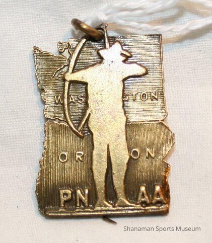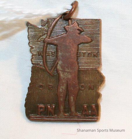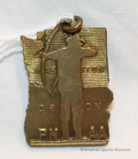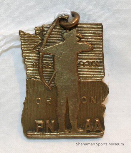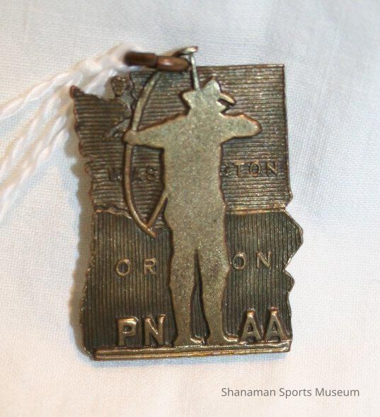 Five metal emblems from the Pacific Northwest Archery Association competition are shown in 1939 after they were presented by Harry C. Johns, president of the PNAA. The 1938 Boys Junior Championship National Archery Association of the United States championship was awarded to Harry “Sonny” Johns. Johns, of Tacoma, was a Pacific Northwest champion and the Washington State Archery Association’s Junior Champion from 1937-1940. It was during that time Johns won the boys national junior title as well. The national association consists of 49 chartered state organizations and nearly 1,000 clubs. Various classes of archery within the association include are bow, freestyle, freestyle limited, freestyle bowhunter, traditional, freestyle limited recurve and crossbow. Donated by Frances Johns Kern.