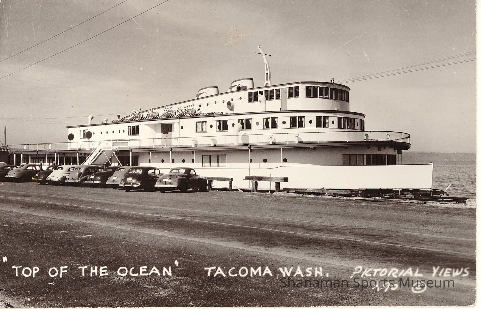 The stationary vessel Top of the Ocean was the headquarters for the Tacoma Athletic Club starting in the 1930s. The boat was the brainchild of Allen Rau and Bert Sungren who had local boat builders construct an ocean-liner on pilings at the water’s edge along the Ruston Way shoreline. The main deck seated 700 people for dinner and dancing on a hardwood floor with a stage and orchestra. The main deck hosted banquets, dinners, fashion shows and more. The upper deck was home to the TAC. In 1948 the commission purchased the structure along with lots on the land for parking. The Top of the Ocean burned to the ground in April 1977 after a case of arson.