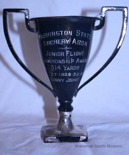 A wooden and gold-finished archer trophy is evidence of the marksmanship of Harry “Sonny” Johns of Tacoma. Johns was a Pacific Northwest champion and the Washington State Archery Association’s Junior Champion from 1937-1940. Johns also won the 1938 Boys Junior Championship National Archery Association of the United States. The national association consists of 49 chartered state organizations and nearly 1,000 clubs. Various classes of archery within the association include are bow, freestyle, freestyle limited, freestyle bowhunter, traditional, freestyle limited recurve and crossbow. Donated by Frances Johns Kern.