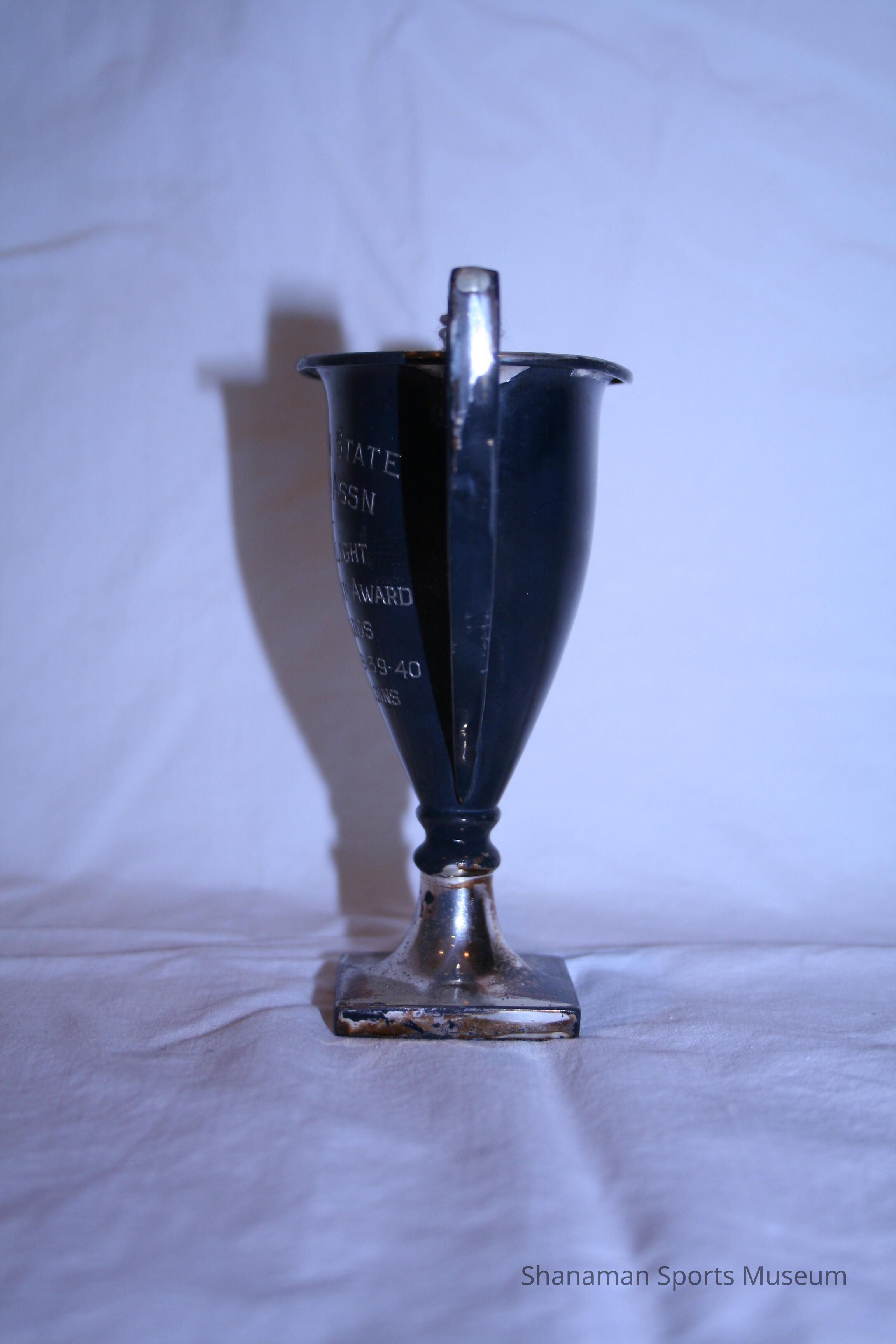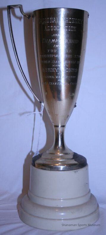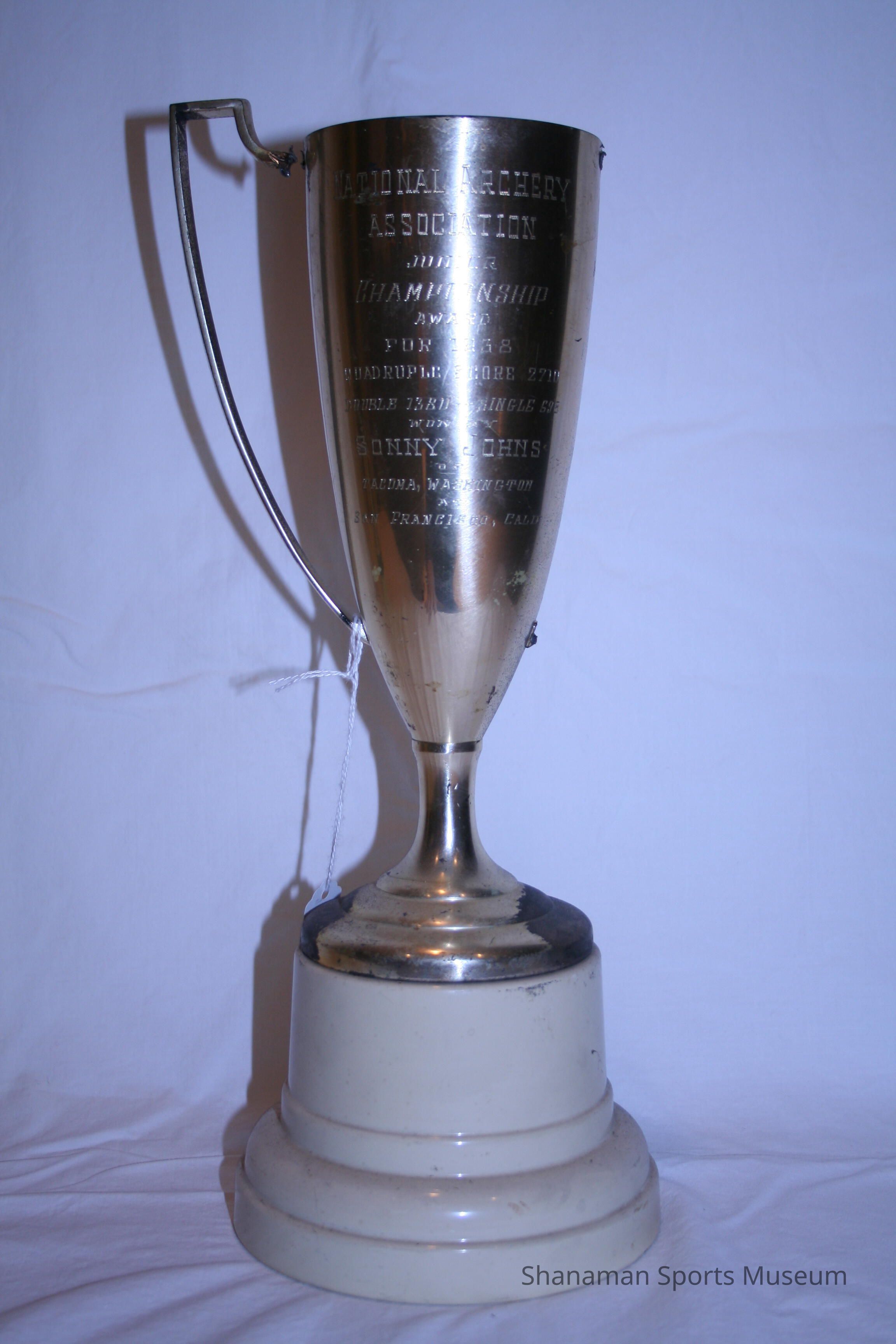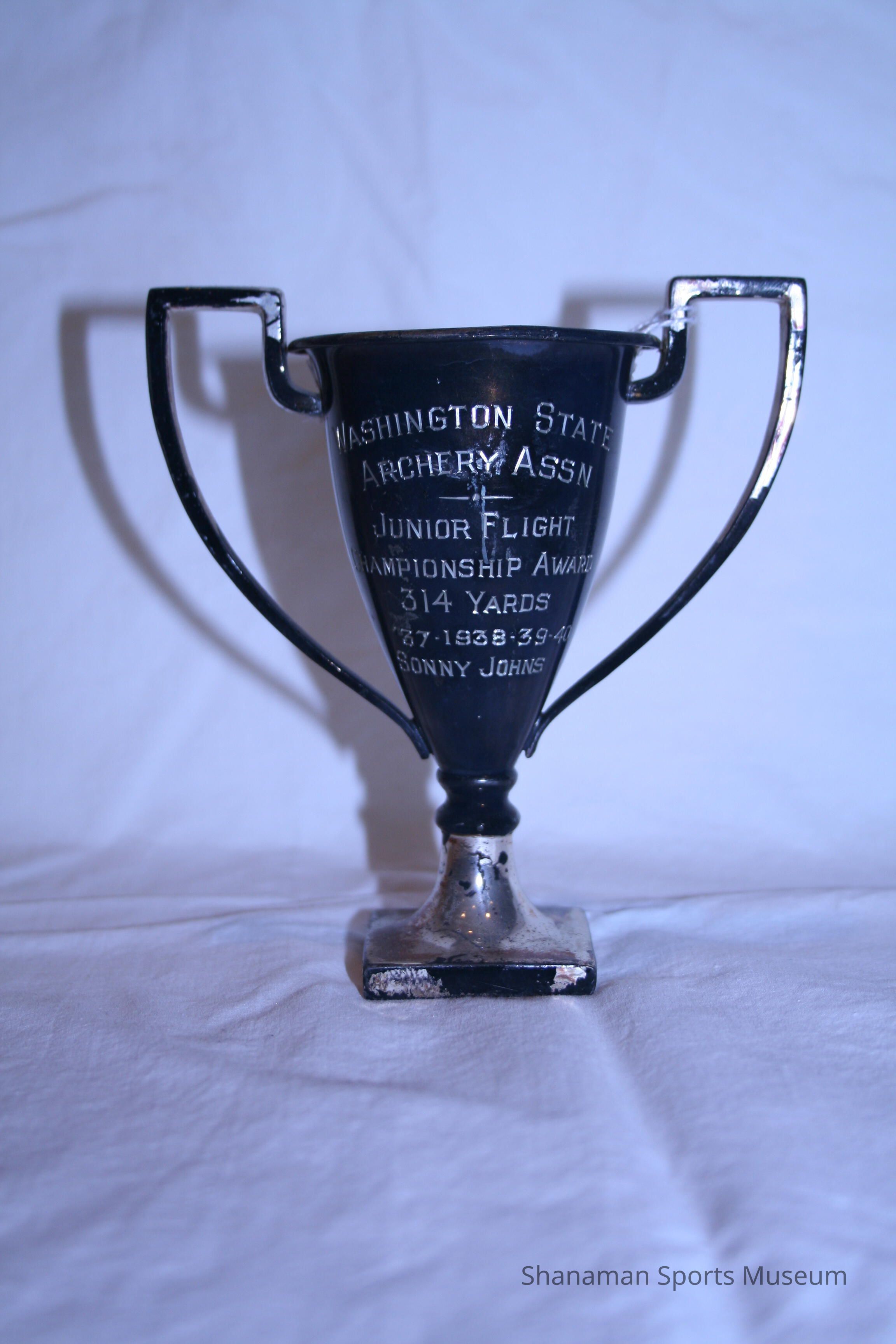 Harry “Sonny” Johns of Tacoma was an accomplished archer in the northwest and national level, as proven by this trophy won by Johns. The trophy was awarded to Johns from the National Archery Association Junior Championship in 1938. Johns recorded a quadruple score 2,710, a double score of 1,380 and a single score of 698, in San Francisco. Johns was a Pacific Northwest champion and the Washington State Archery Association’s Junior Champion from 1937-1940. It was during that time Johns won the boys national junior title as well. Donated by Frances Johns Kern.