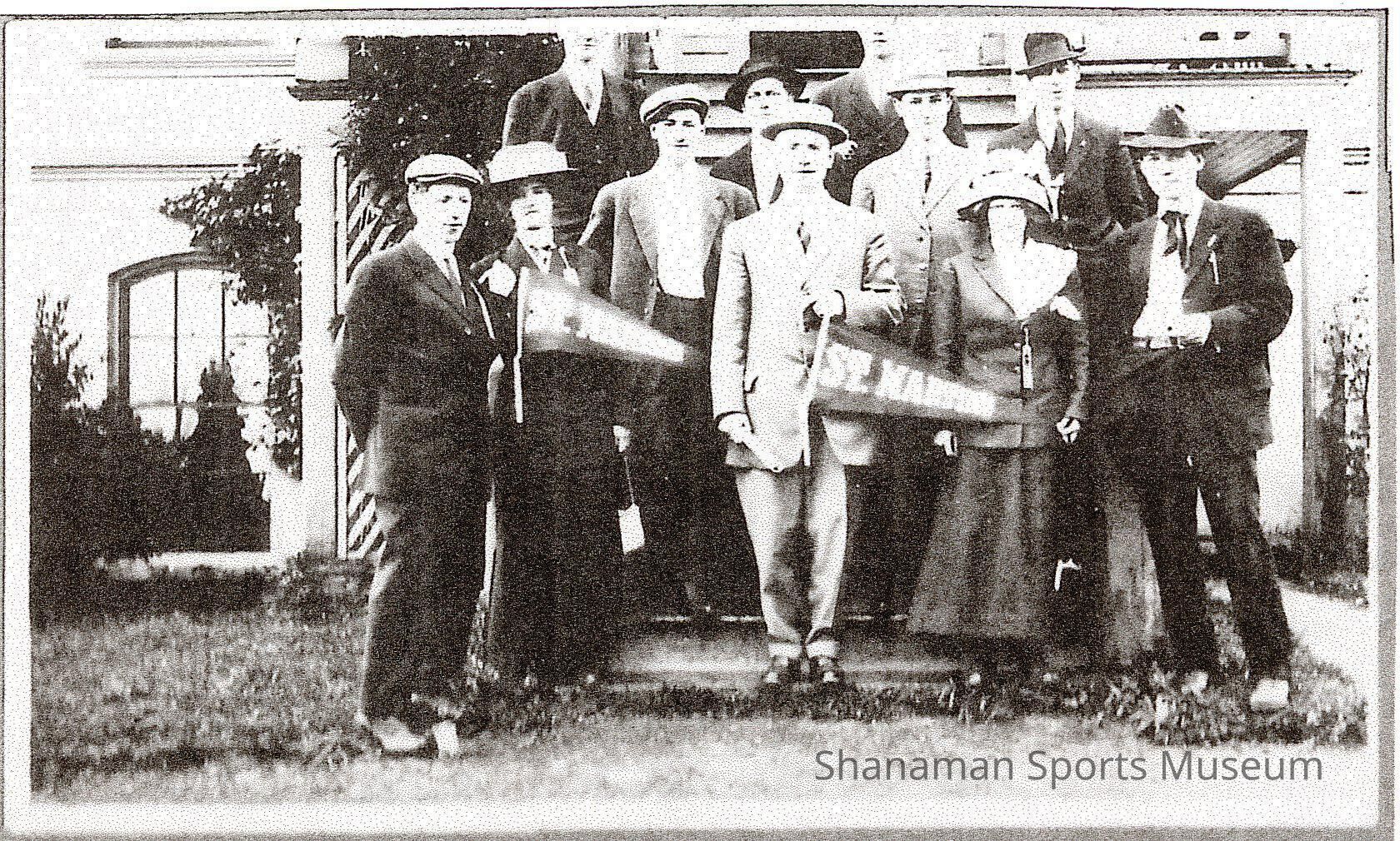 Copy of b/w photograph of men and women holding St. Martins College pennants. Allan Browne is in the center. Browne played on the 1915 Tacoma team that went to San Francisco to play Cleveland for the championship as well as many other Tacoma baseball teams.