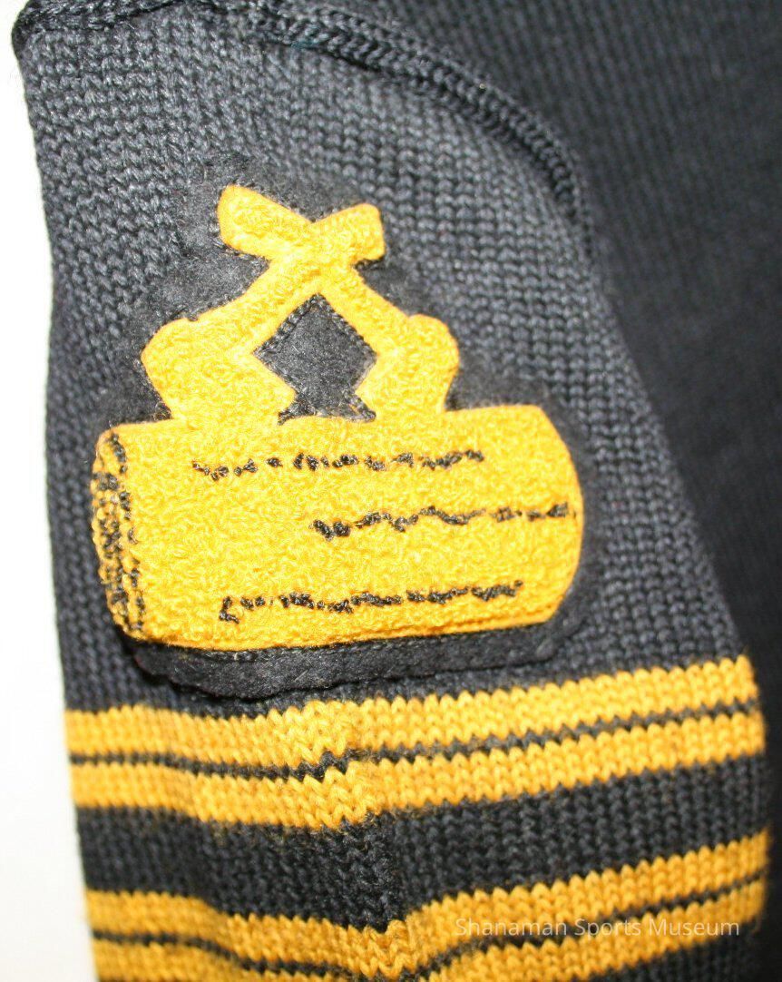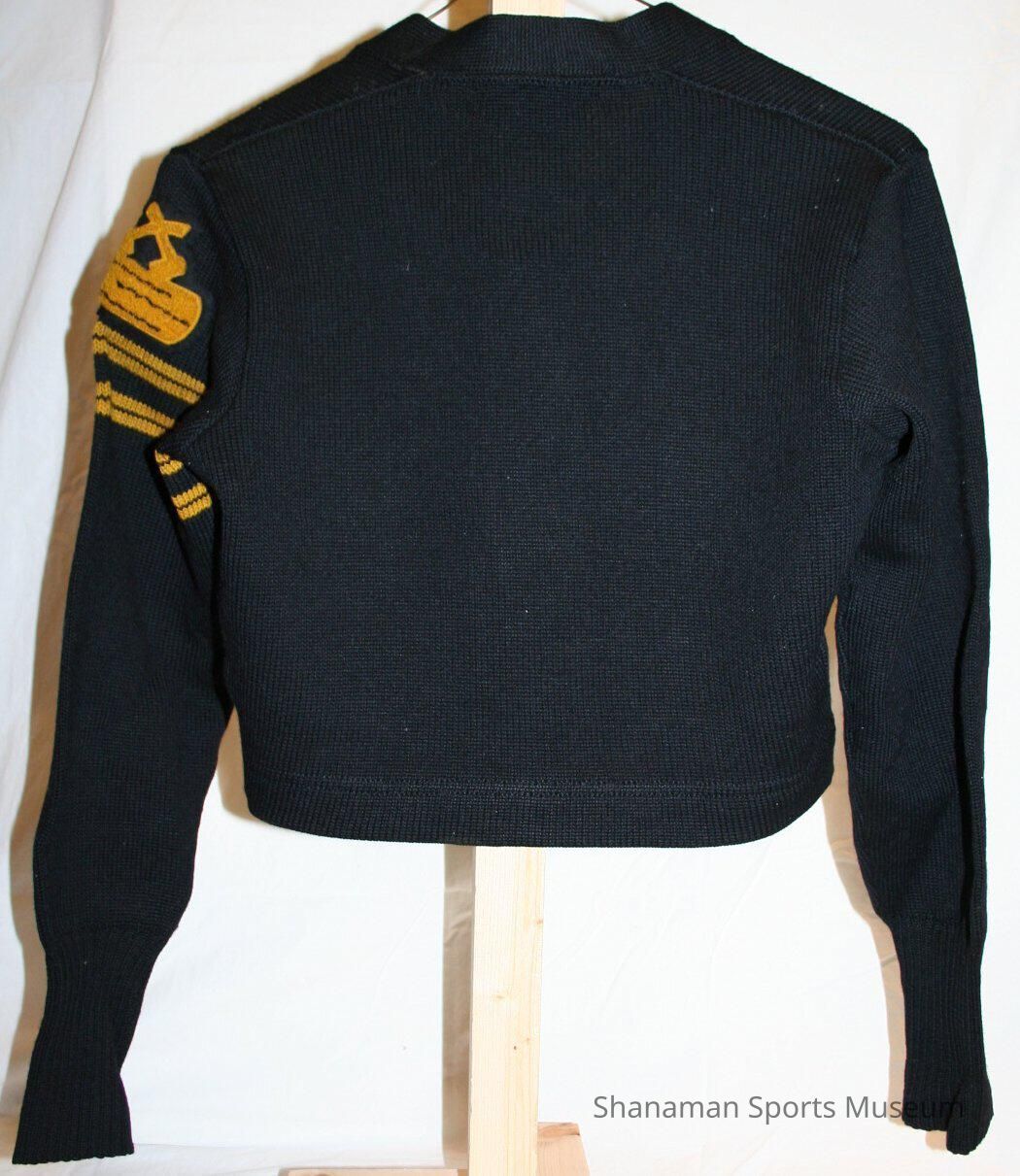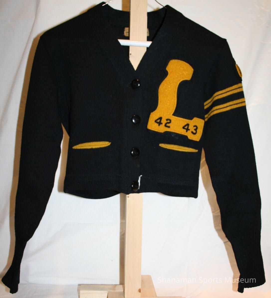 Sweater, letter, wool, girls. Lincoln Letter Lassie sweater earned by Janet Blanchard Browse, Lincoln High School, Class of 1944. Letter Lassie earned by playing intramural sports for three seasons. Blanchard earned letter in 1942 and 1943. Black wool. Patch and yellow stripes on left sleeve.Lexicon