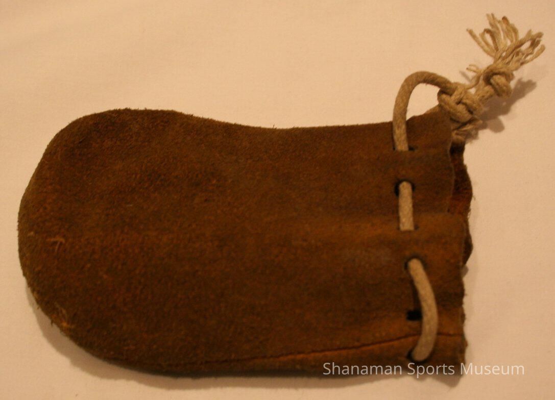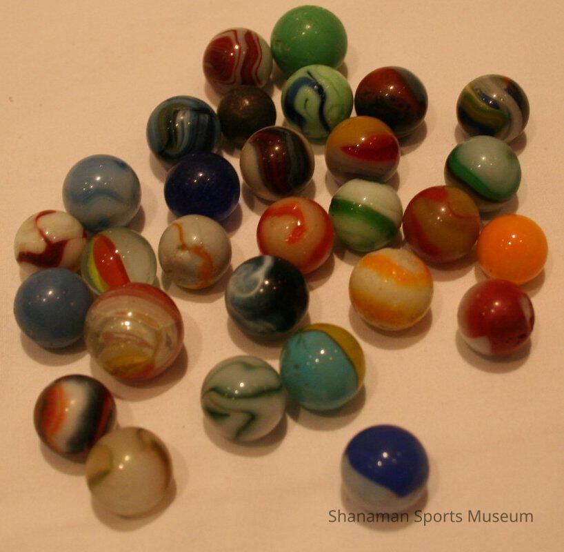 A display of marbles, small glass, multi-colored, two large shooters and a rawhide marble bag with a drawstring were donated by Billy and Jeanne Pitt. Marbles was a very popular game of chance played by children from about 4,000 B.C. played in Rome and ancient Egypt. The game migrated to Europe and the United States, with children playing the game in the streets, playgrounds and in backyards.Lexicon