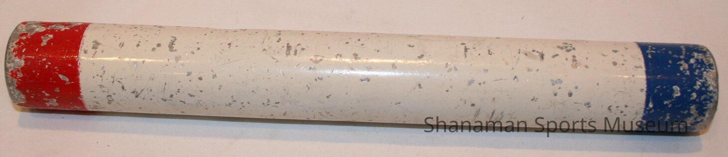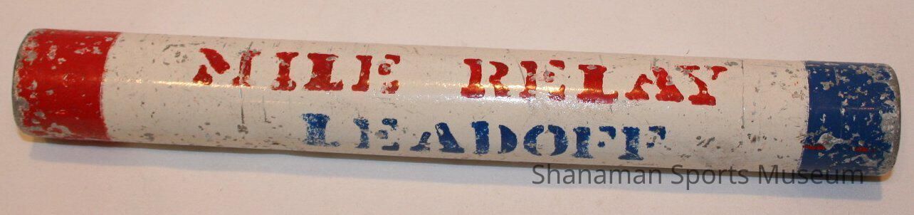 The baton is painted white with red and blue paint at the end. “Mile relay leadoff” is stenciled in the center.Lexicon
