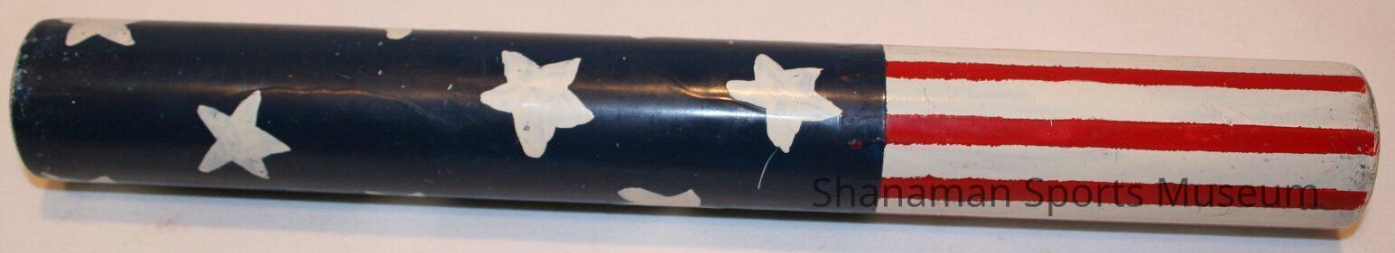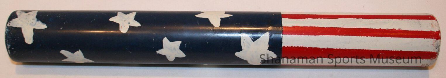 The baton is painted with white and red stripes on one-third of the baton, with white stars on a blue field on the remaining two-thirds of the baton.