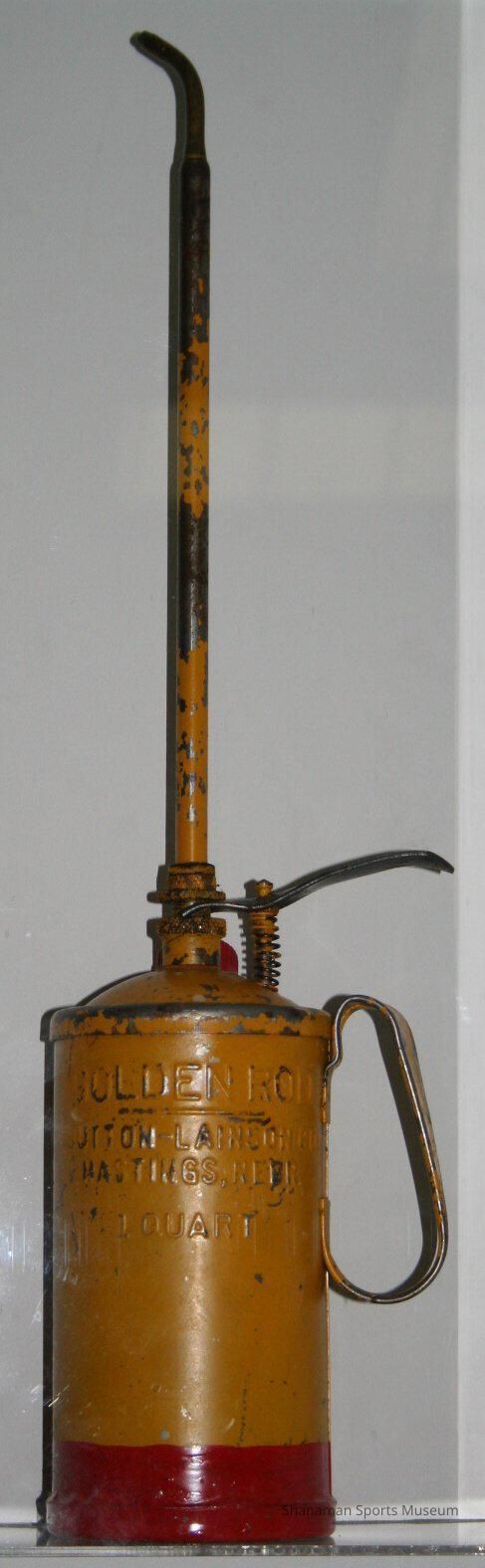 A yellow, metal oil can is part of a collection donated by Bill Seidelman. Seidelman was a riding mechanic in auto racing in the 1920s then started building midget cars in the 1930s. Seidelmnan’s son, Bill Jr., established Seidelman Racing Enterprises in 1952 where he raced and built midget cars for people across the Pacific Northwest. Seidelman was a longtime member of the Western Racing Association, Washington Midget Racing Association, Untied States Auto Club, West Coast Vintage Racers and was a Hall of Fame member of the Golden Wheels, a vintage racing fraternity.