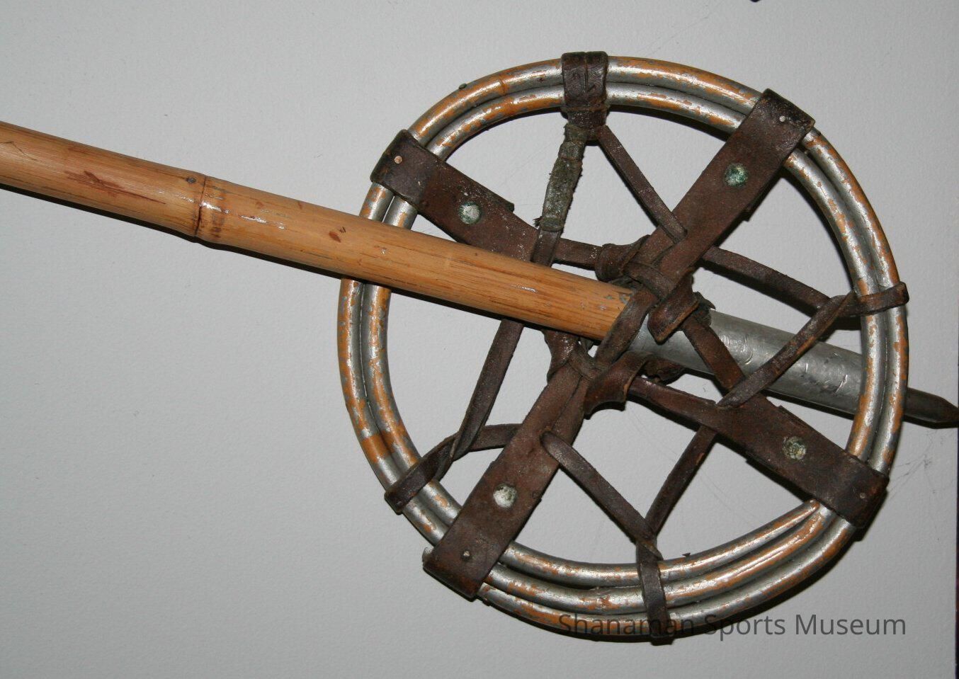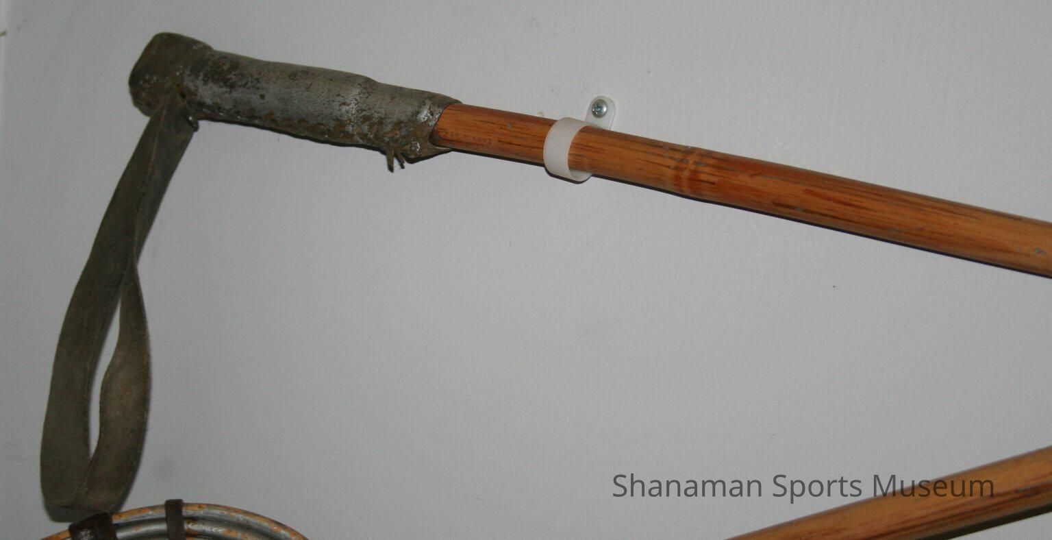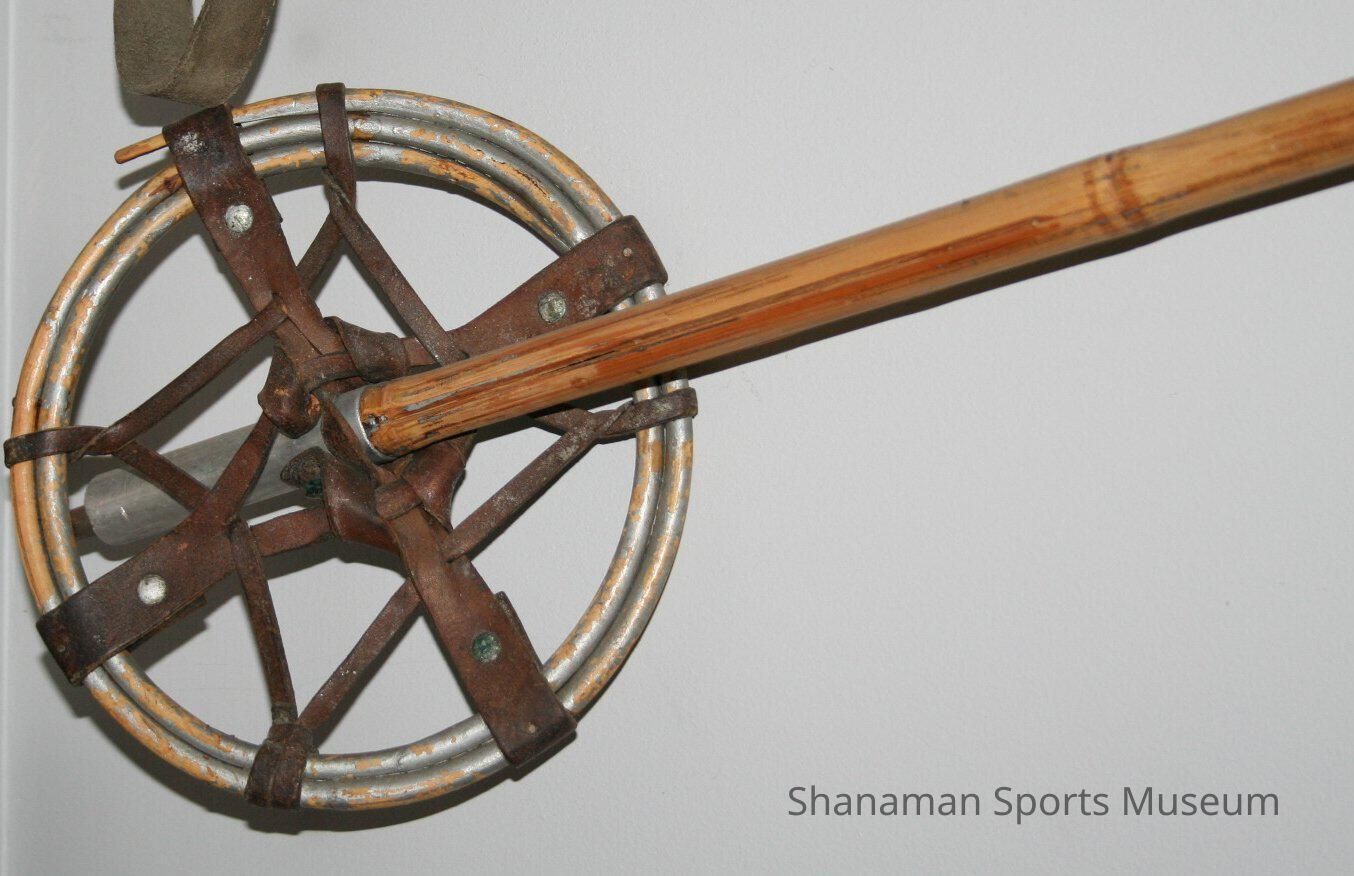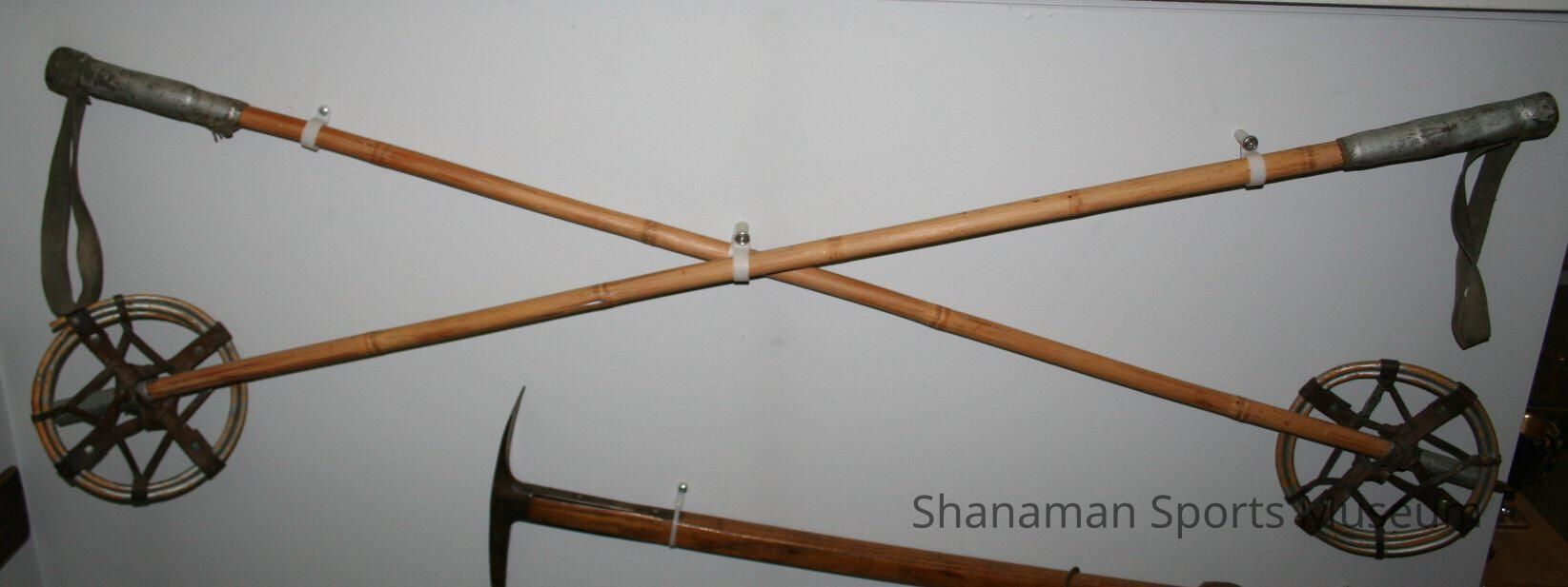 Accomplished Pierce County ski instructor Joe LaPorte donated these bamboo poles with oversized baskets. The 53-inch poles have leather hand grips painted silver. While some skiers still use bamboo poles, most modern poles are aluminum or carbon fiber. LaPorte taughts legions of skiers how to his the slopes at the Tacoma and Cascade ski schools.Lexicon